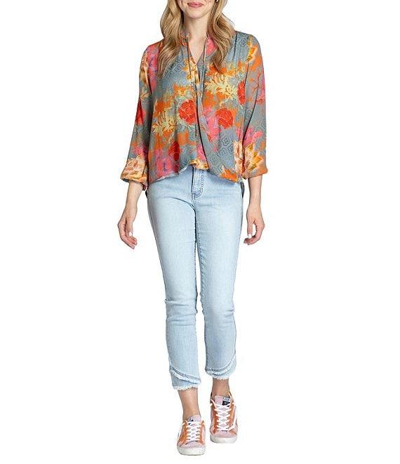 From APNY, this top features: natural crepe fabrication boho floral print v-neckline 3/4 sleeves tassel detail pullover construction approx. 23" length cupro/viscose machine was/tumble dry Imported.
