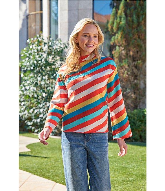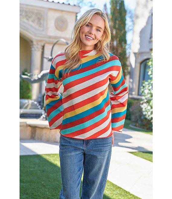 From APNY, this top features: Knit fabrication Mock neckline Long sleeves Stripe print Straight hemline Pullover construction Approx. 24" length Viscose/polyester/nylon Machine wash Imported.