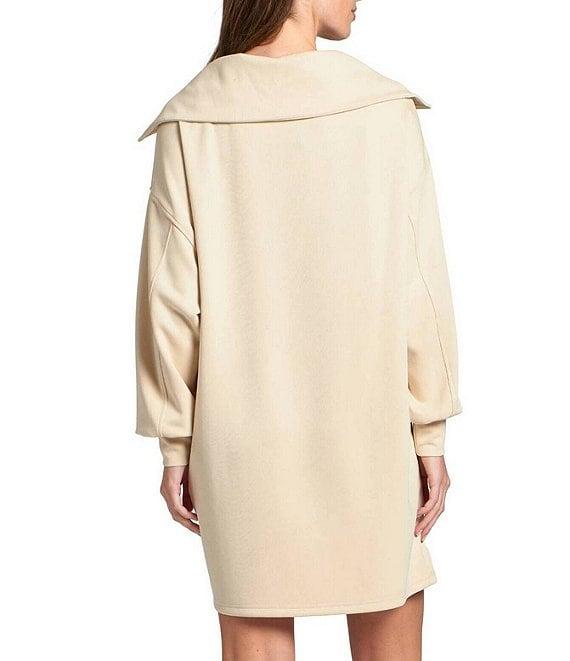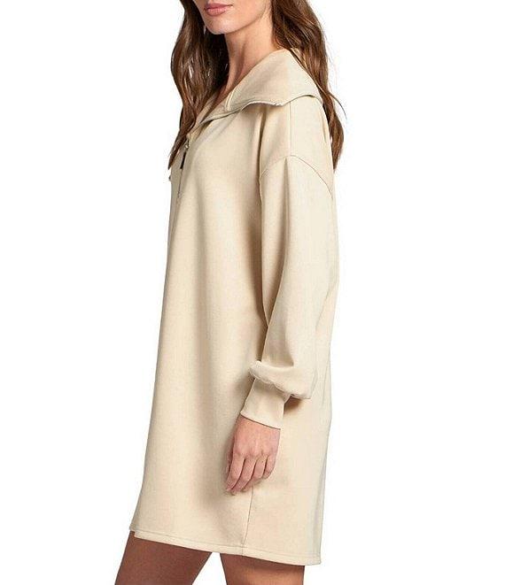 From APNY, this dress features: Knit fabrication V-neckline Long sleeves with elastic cuffs Shift silhouette Functional seam pockets Mini length Oversized fit Straight hemline Front partial zip closure Approx. 33" length Modal/polyester/spandex Machine wash Imported.