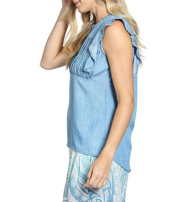 From APNY, this top features: Round ruffle neckline Flutter sleeves Smocked Rounded hemline Pullover construction Approx. 22" length, from top shoulder to hem Tencel Machine wash Imported.