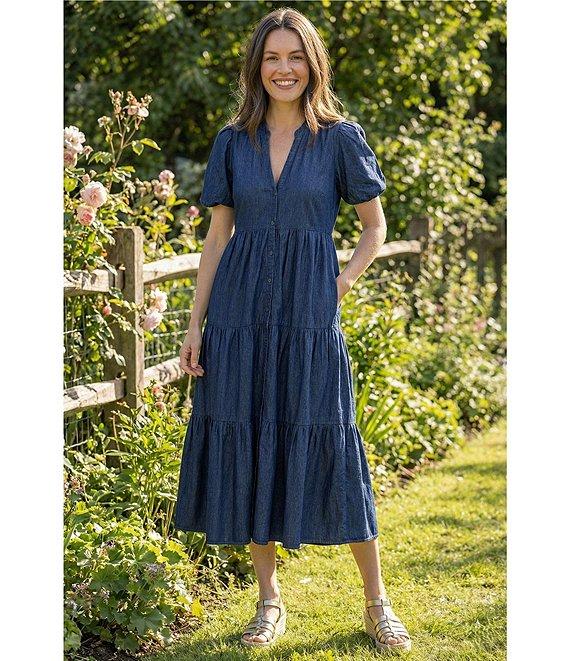 From APNY, this dress features: A-line silhouette Split round neckline Short puff sleeves Tiered hemline Button front closure Pullover construction Approx. 50.25" in length Cotton; unlined Machine wash/tumble dry Imported.
