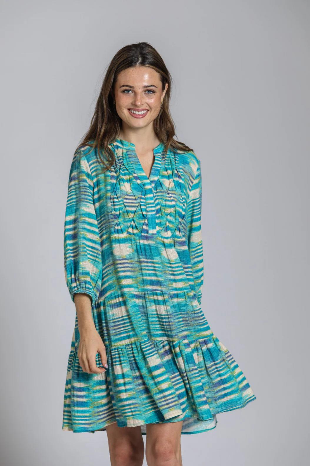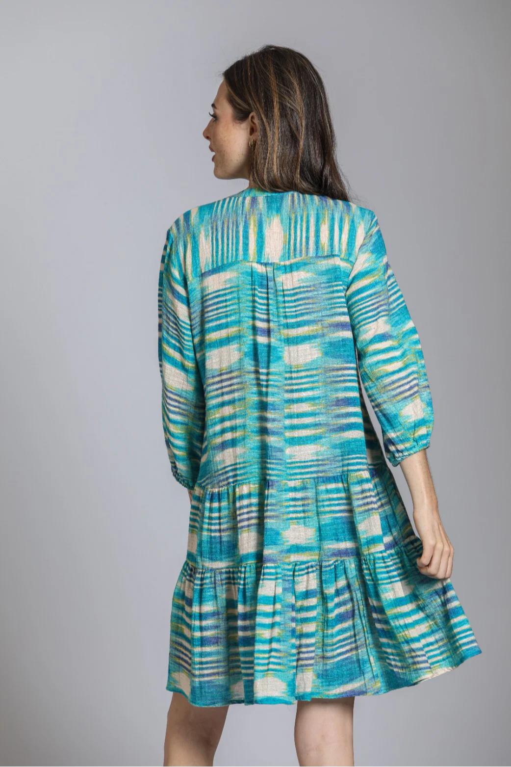 Effortlessly elegant, the Tiered Dress with Tucked Bodice Detail is a wardrobe must-have for any occasion. This dress combines timeless design with modern touches to create a look that’s both stylish and versatile. Cool 100% cotton fabrication in an ocean effect print.