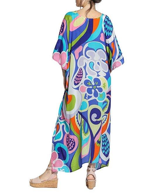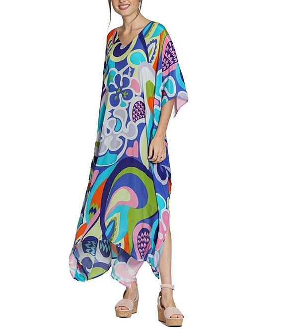 APNY Woven Abstract Print V-Neck 3/4 Sleeves Kaftan Maxi Dress