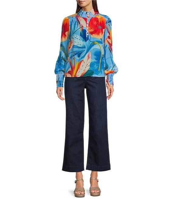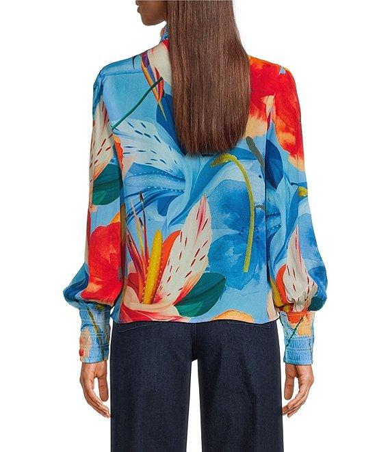 APNY Woven Floral Print High Neck Long Puff Ruched Sleeve Blouse