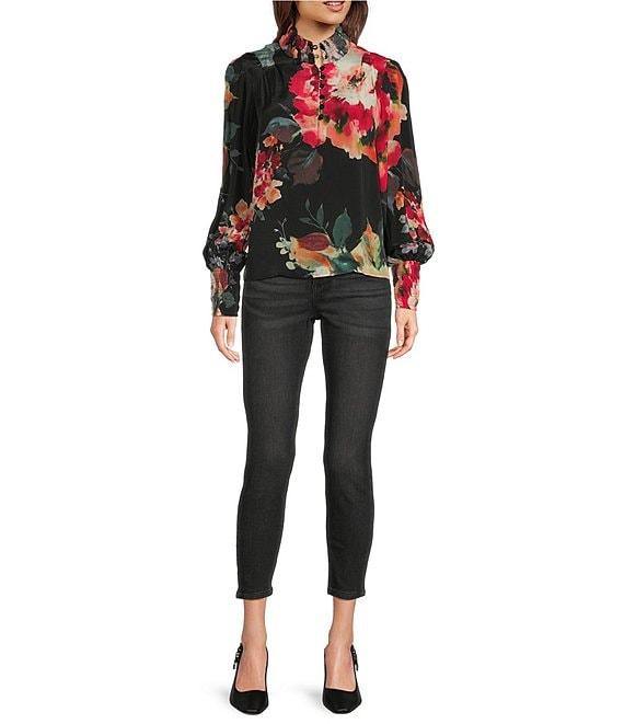 APNY Woven Printed High Neck Puff Long Sleeve Ruched Blouse