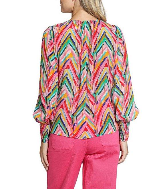 APNY Woven Printed Round Neck Long Sleeve Smocked Blouse