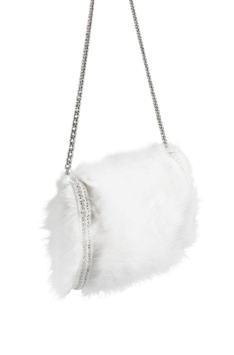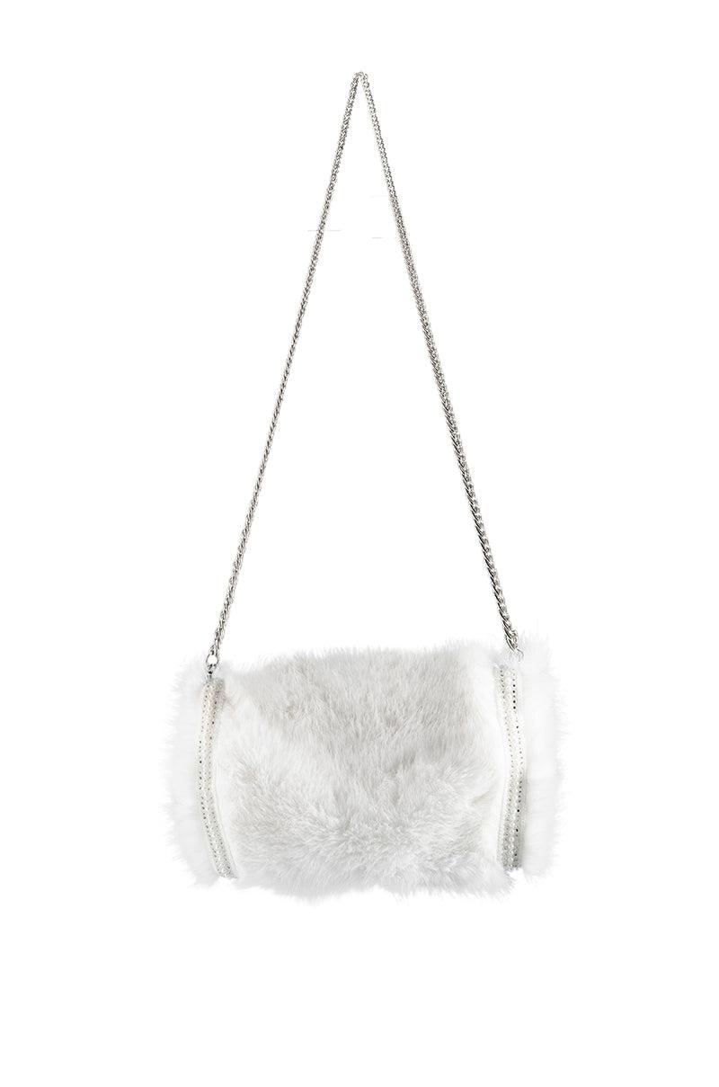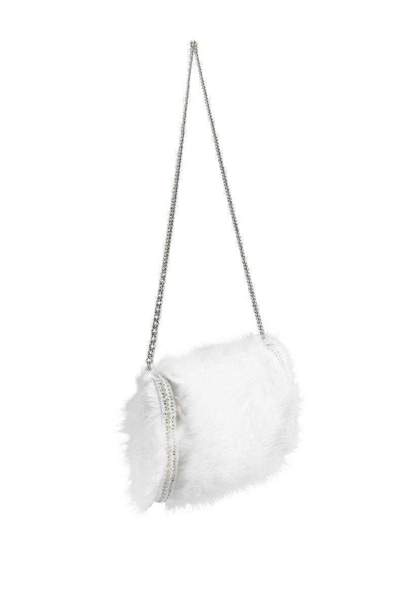 The AKIRA Label Apres Ski Embellished Faux Fur Muff In White is made from a soft faux fur fabrication and features rhinestone and pearl-embellished side trim, light polyester lining, and open sides to keep your hands and forearms cozy. Complete with a detachable twisted chain neck strap for easy on-the-go chic style! - Faux Fur Shell: 100% Polyester, Lining: 90% Polyester 10% Spandex - Dry Clean Only (All measurements approximate from size O/S) - 13” Muff Length x 2” Width x 8.5” Height - 41.5“ Chain Length - Imported Product ID: 373100