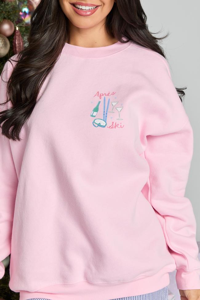 Details Light pink pullover with holiday cocktail & skiing design Crew neckline Long sleeves Material and Care Pink Lily Exclusive Sweatshirt 57% Cotton/43% Polyester For best results, wash inside out on a gentle cycle with cold or lukewarm water. Tumble dry low or hang to dry to keep your tee looking fab! Size and Fit Relaxed fit Length: 26"