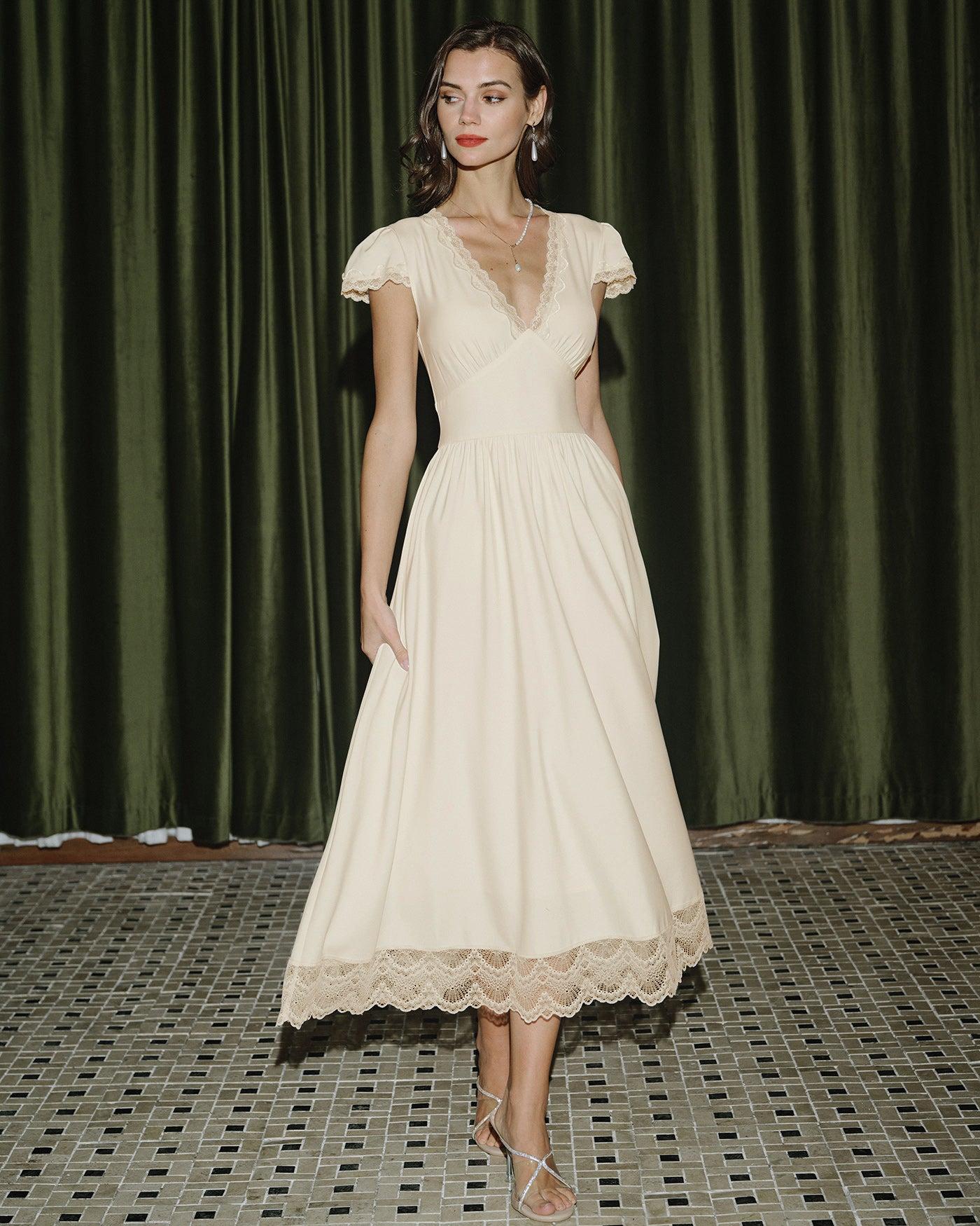 - Occasion: Daily - Style: Elegant - Season: Summer, Spring - Fabric Stretch: No Stretch - Waist: Natural Waisted - Sleeve Length: Short Sleeves - Sleeve Type: Puffed Sleeve - Pattern Type: Solid - Embellishment: Zipper, Lace, Splicing - Neckline: V Neck - Dress Type: Tunic - Silhouette: A-Line - Fabric: Polyester 100.0% - Lining: Polyester 100.0% - Material: Polyester - Pattern Style: solid