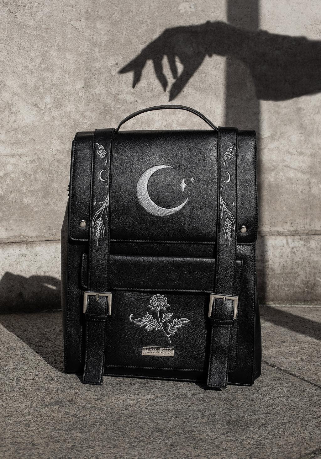 Under the full moon - Black floral moon embroidered satchel with convertible straps - Large square shape holds all your daily essentials (whether at work or at play) - Fastens with magnetic closures on flap & faux buckles for security - One external compartment, two internal pouches & one internal zipped pocket to organise your supplies - Sleek black faux leather for a worn-in look with floral moon embroidery on flaps & straps - Adjustable, convertible straps let you carry on your back, by your side, or in your hand - Silver hardware & branded nameplate add a soft glisten to this celestial piece Main: 100% PU leatherLining: 100% cotton
