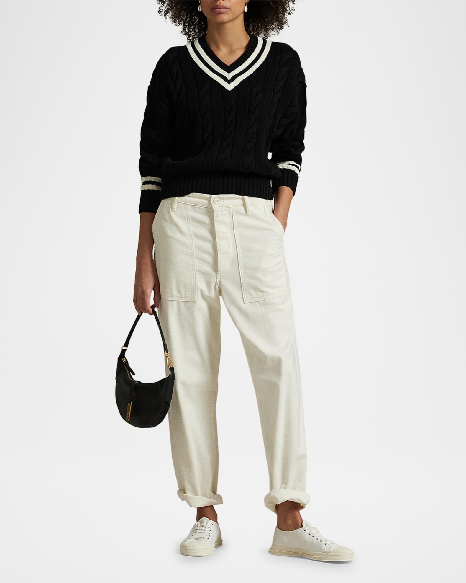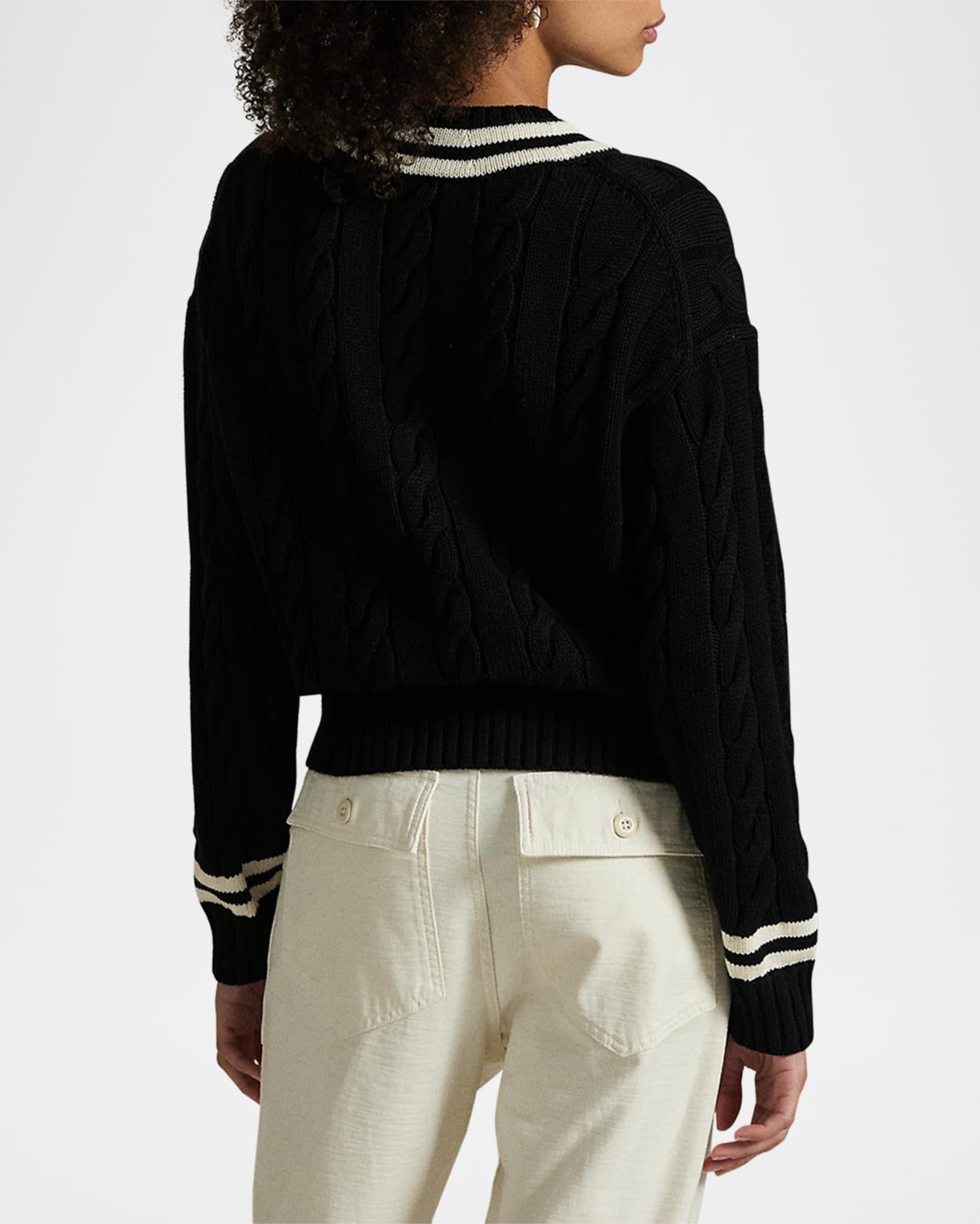 Polo Ralph Lauren aran-knit sweater inspired by the classic cricket sweater Brightened with contrast stripes on the neckline and cuffs Approx. 22"L from shoulders to hem V neckline Drop shoulders Long sleeves; approx. 20.5"L Relaxed fit Pullover style Cotton Machine wash cold Imported