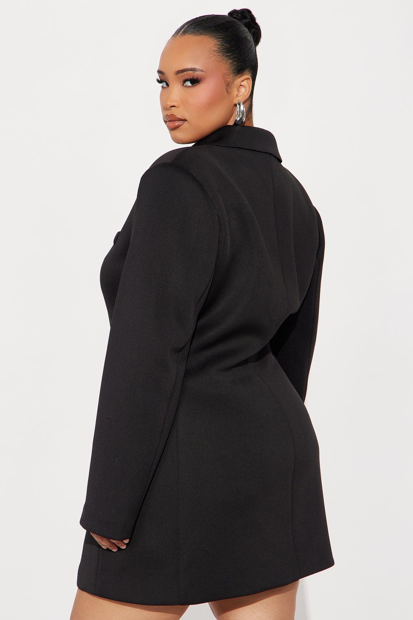 Available In Black And Teal. Mini Blazer Dress Long Sleeve Shoulder Pads Collar V-Neckline Button Up Functional Pockets Lined Stretch Length Measured Flat = 32" Self: 95% Polyester 5% Spandex Contrast: 95% Polyester 5% Spandex Lining: 95% Polyester 5% Spandex Imported