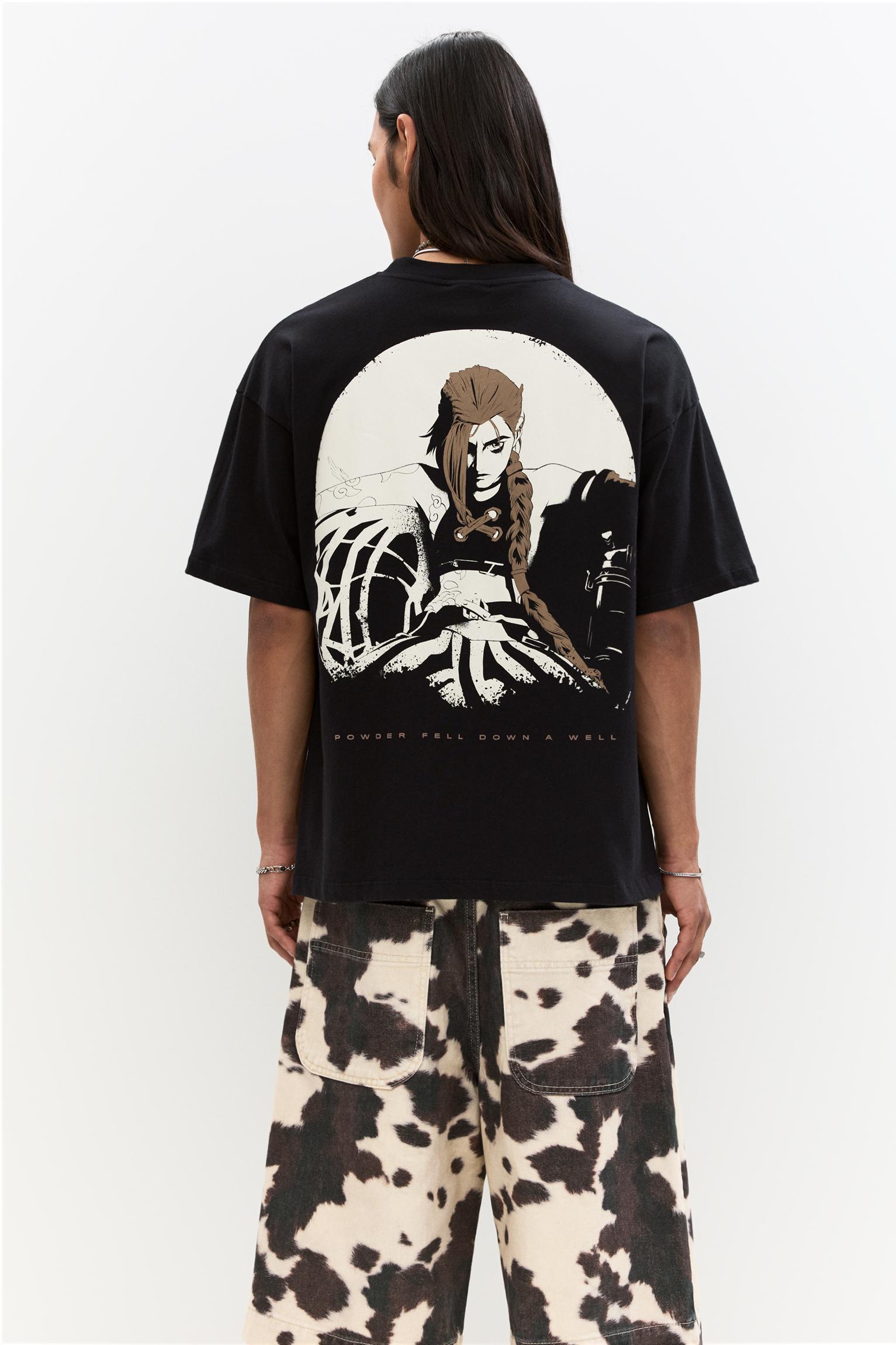 Arcane license black T-shirt with a graphic on the front and back, a crew neck and short sleeves.