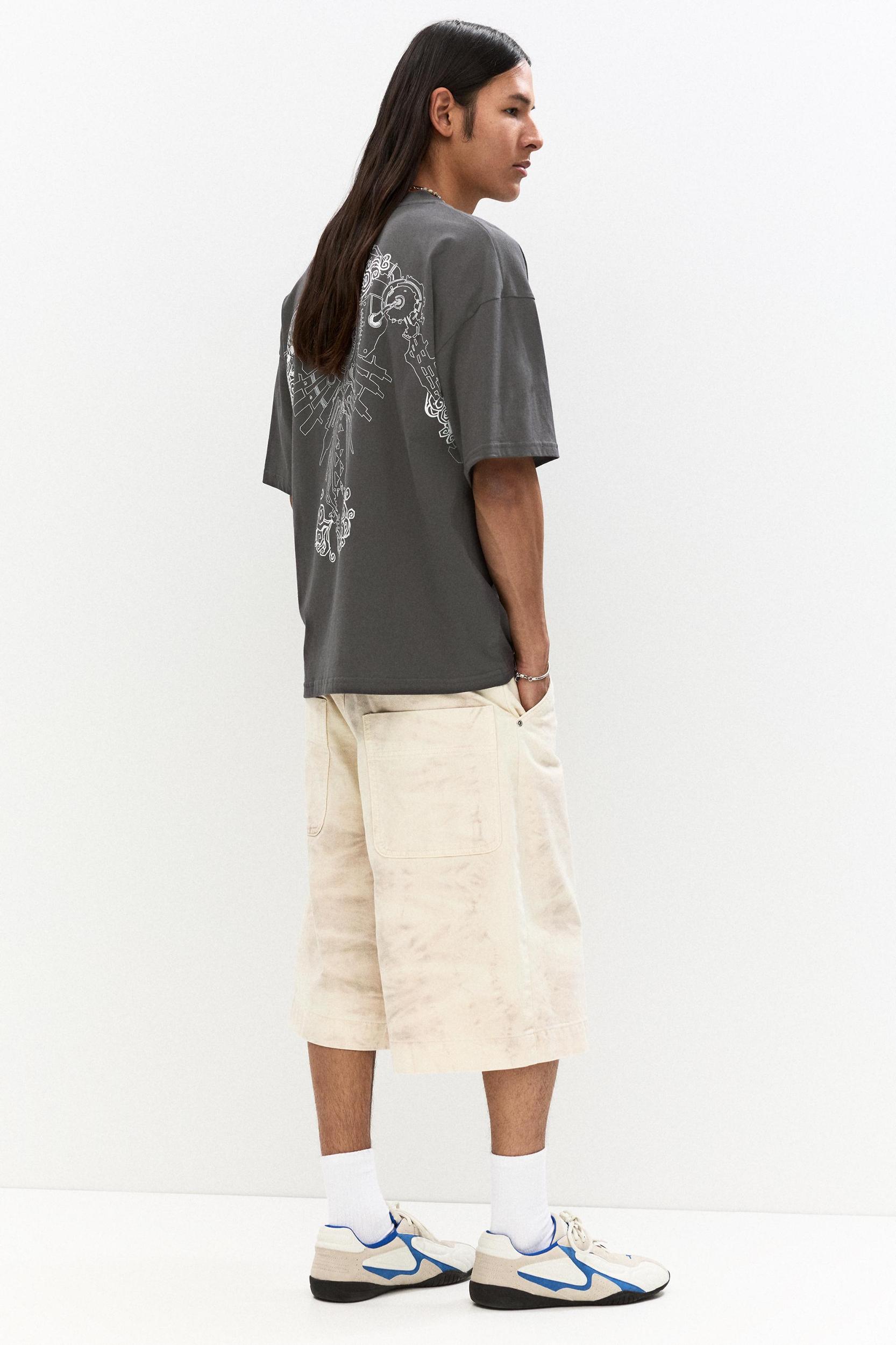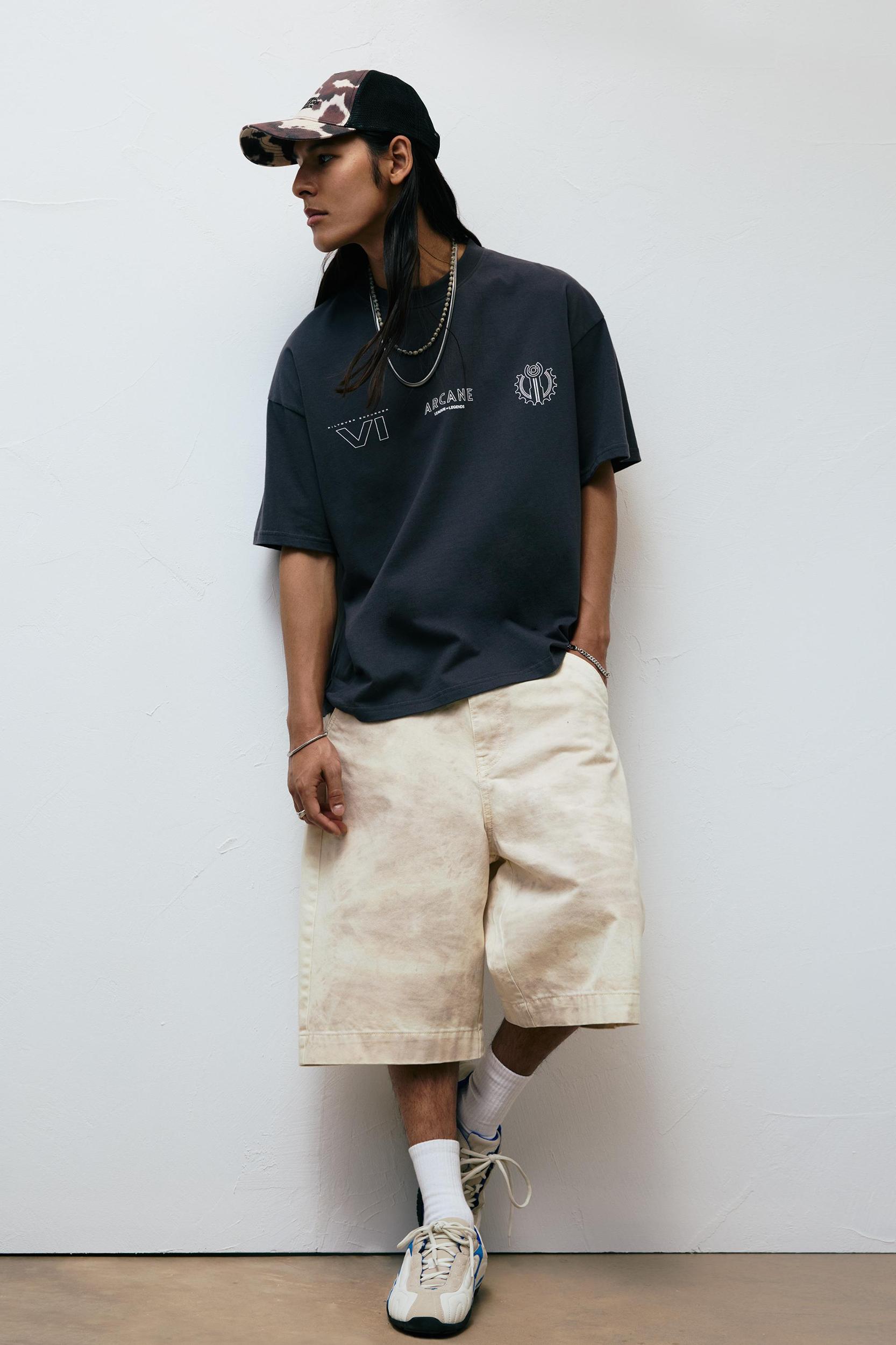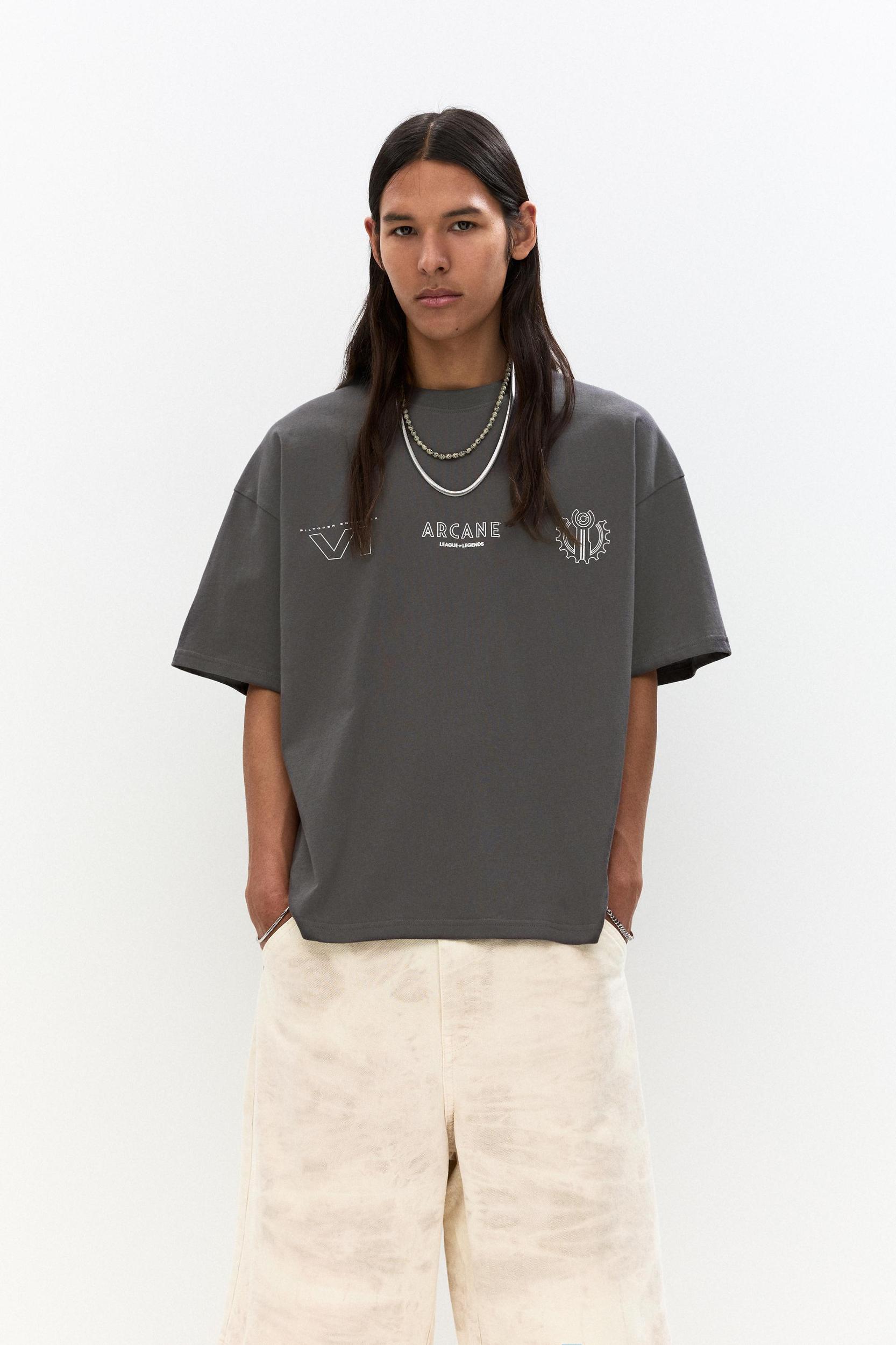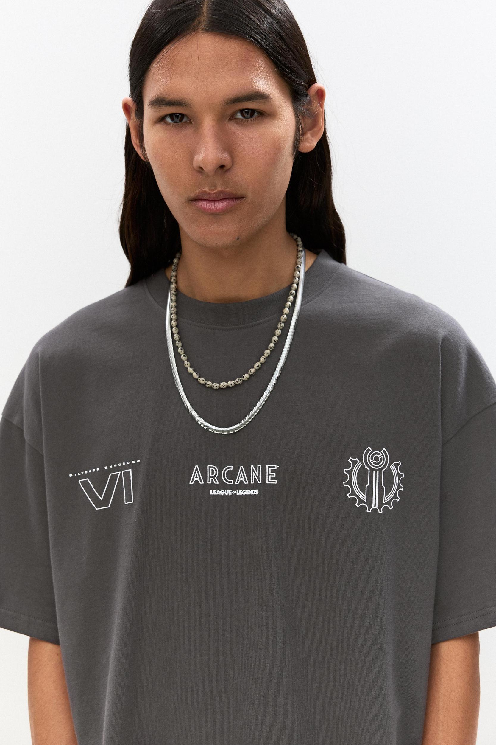 Dark grey boxy T-shirt with a contrast Arcane graphic, short sleeves and a round collar. Made of cotton.