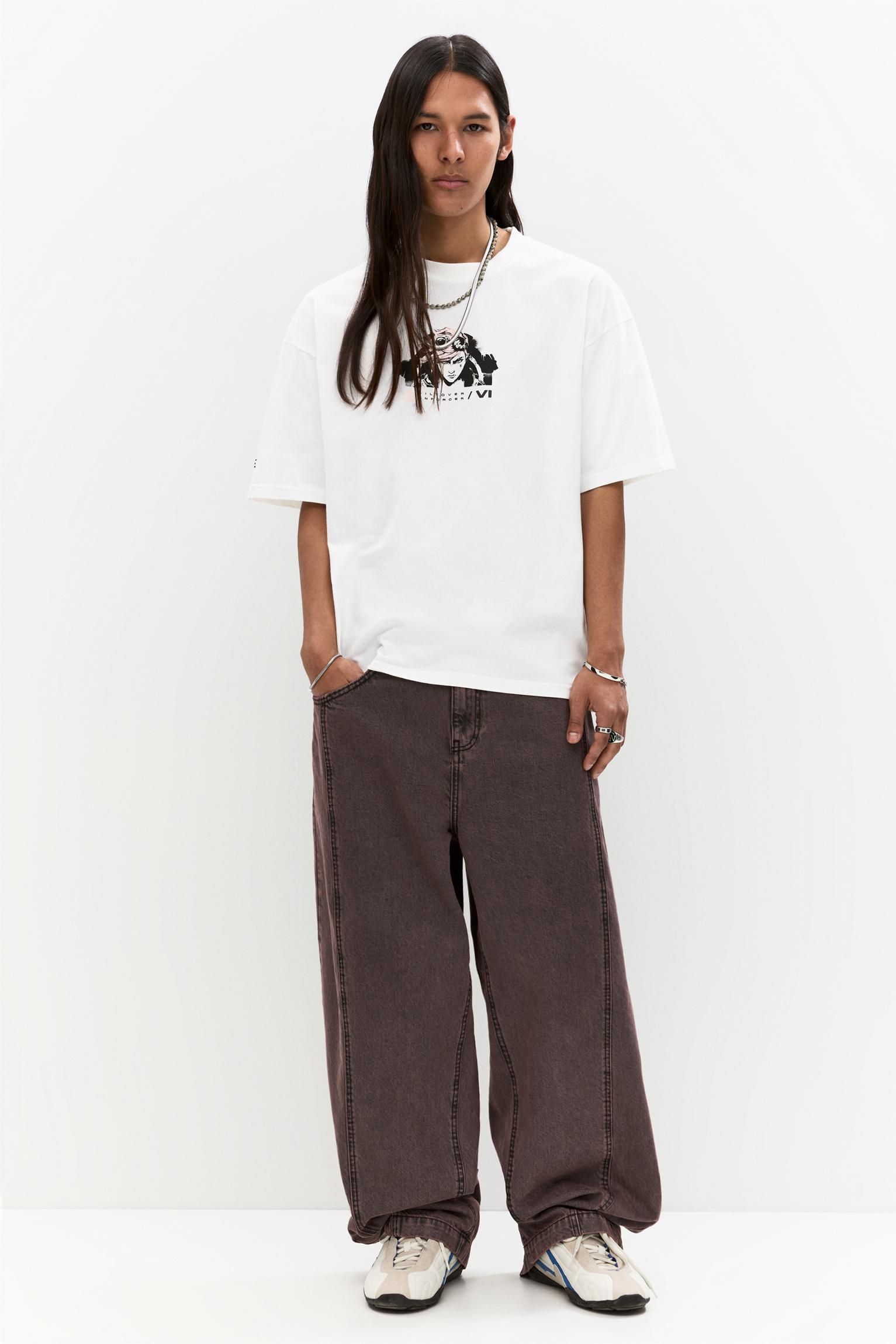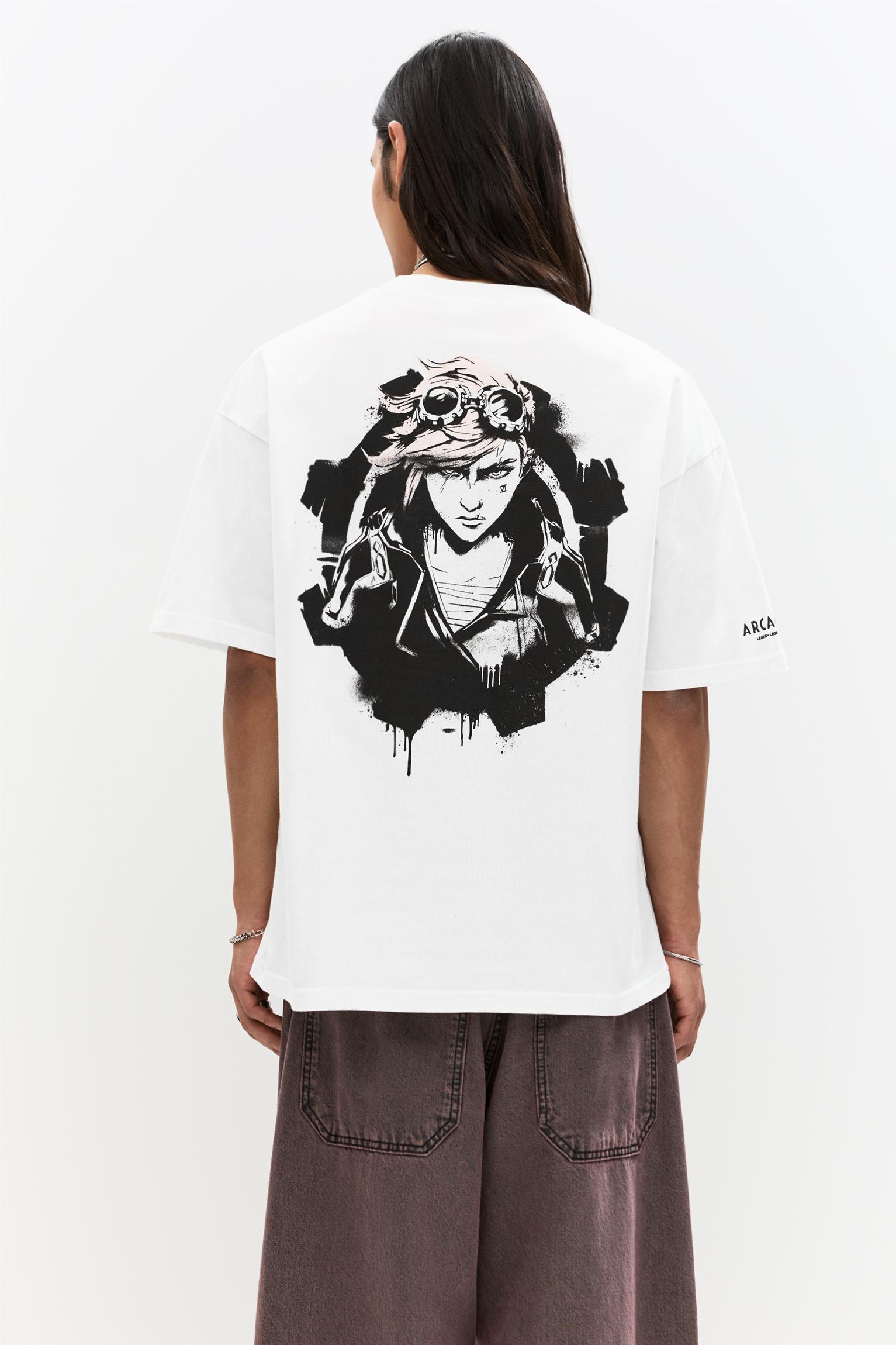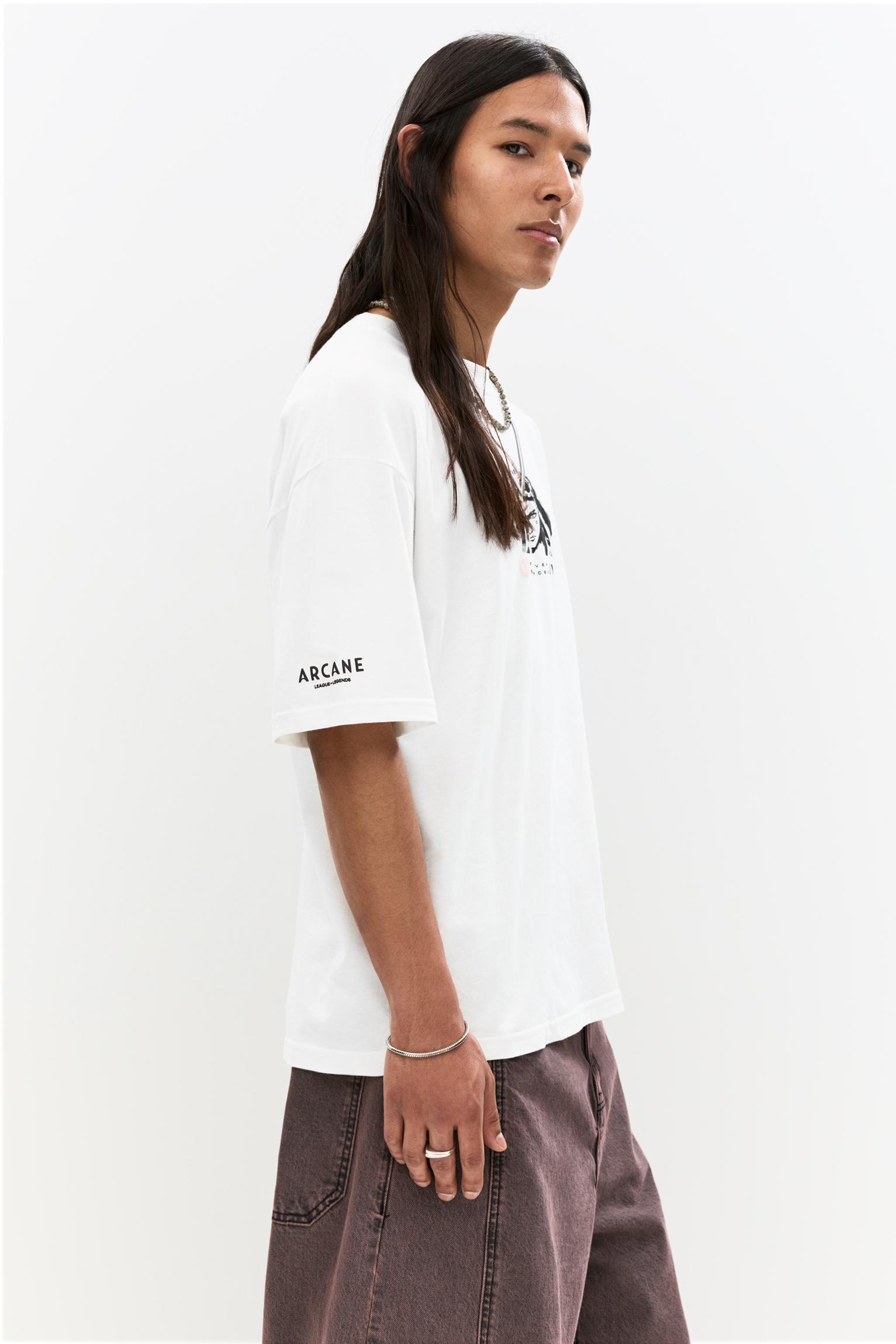 Arcane license ecru T-shirt with a graphic on the front and back, a crew neck and short sleeves.