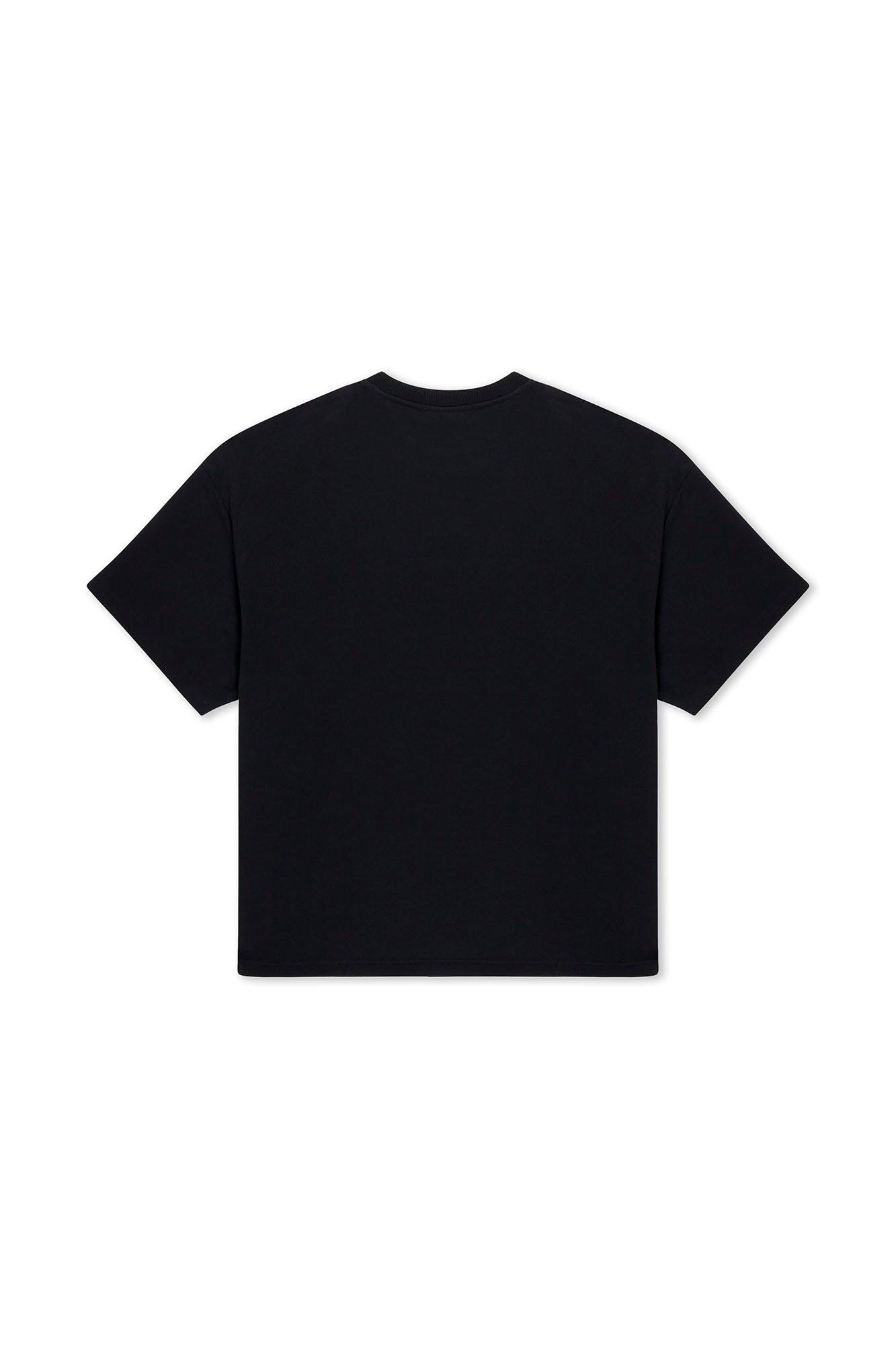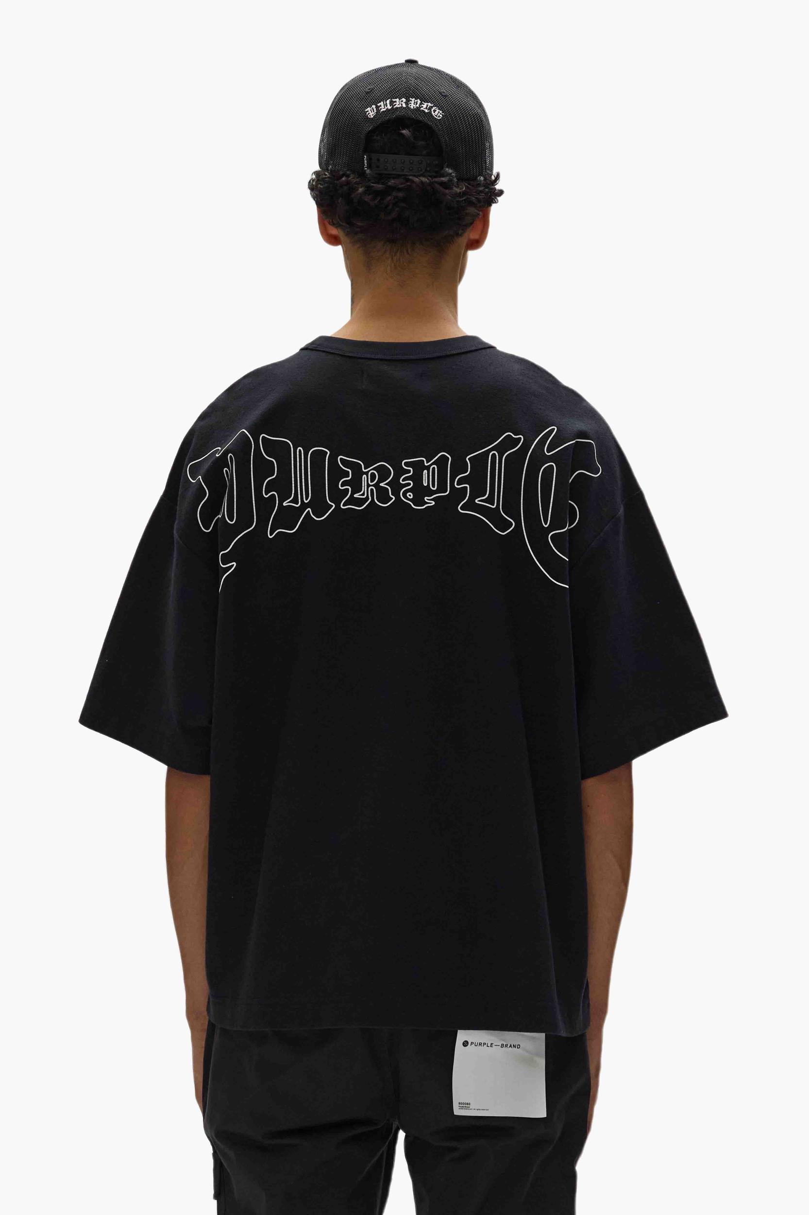 This short-sleeved top is a premium black jersey knit. Featuring Purple Brand logo lettering in front and an arched gothic logo across the shoulders. Spring Summer 2025 White Label 100% Cotton Oversized Fit Textured Jersey Crackle Print