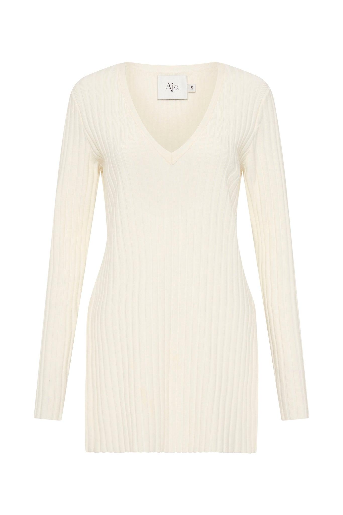 PRODUCT DETAILS Knitted tunic Fitted style Deep V-neckline Split hem detail with logotape trim Shop All Knitwear SIZE AND FIT Model wears a size 8/S Model: 175cm/ 5'9 Bust: 80cm Waist: 60cm Hips: 88cm FABRICATION 72% Ecovero Viscose 28% Recycled Polyester
