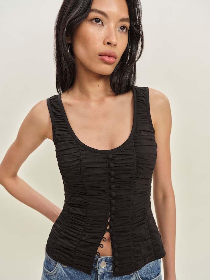 Shop the Archer Top from Reformation, a sleeveless top with a scoop neckline, button closures along the front, and shirring throughout.