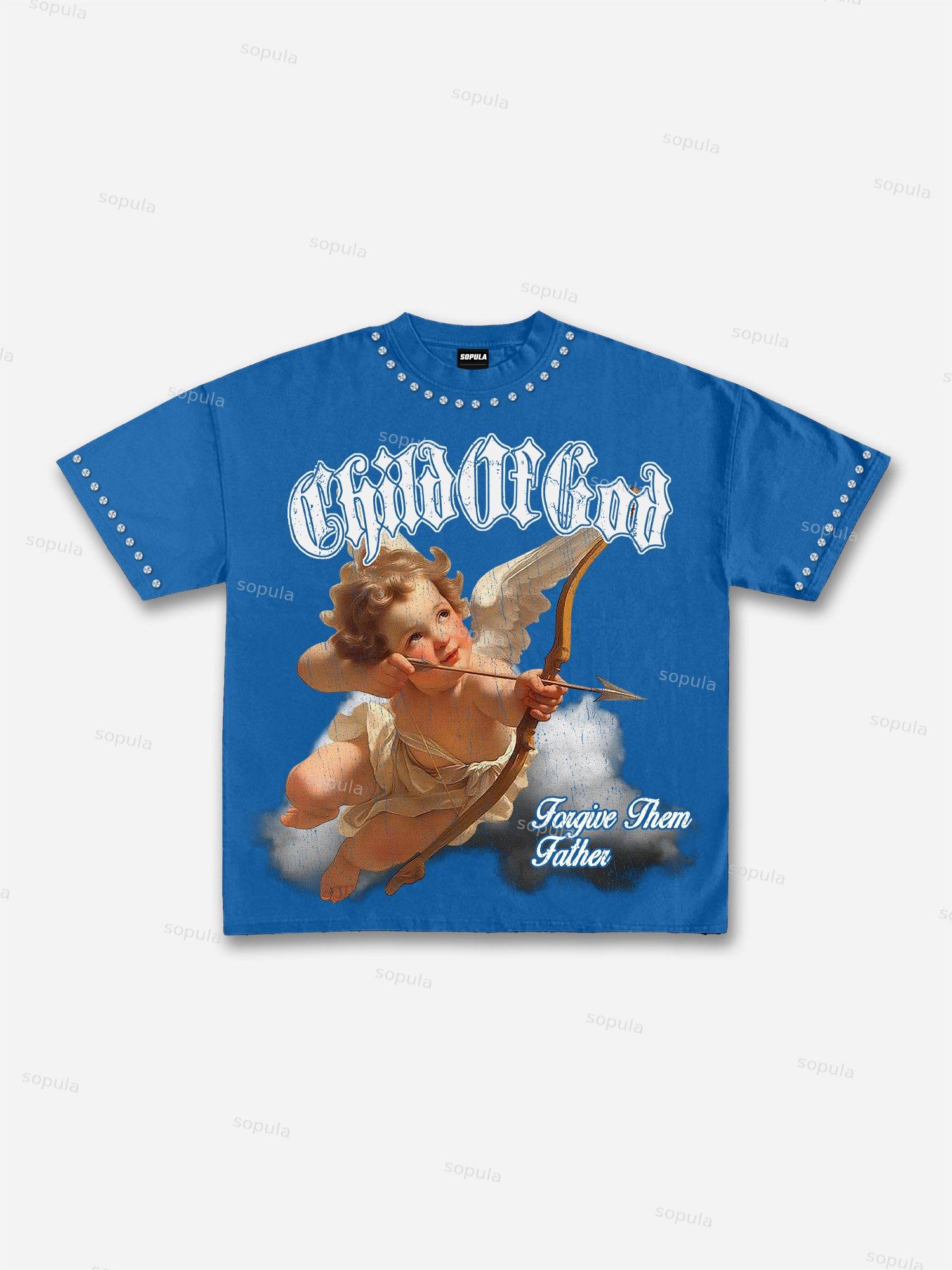 SPU: CP-230086-WJY Fabric: 100% Cotton Fabric Weight: 180g Pattern: Archery Angel Bible Graphic Process: Hot Diamonds Gender: Women,Men Season: Summer Size Range: S-3XL Color: Black,White,Blue Print Position: Front