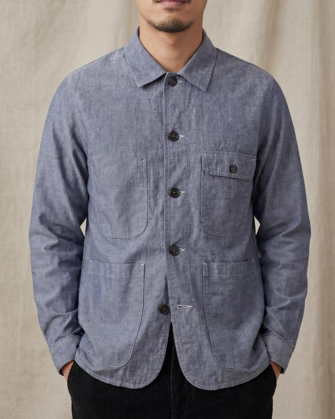 The Scribbler Overshirt is cut from lightweight cotton chambray that feels like a shirt but acts like a jacket. Cut for a regular fit and detailed with three large pockets and curved hem. Finished with corozo fish-eye buttons. The perfect high-summer, lightweight jacket.
