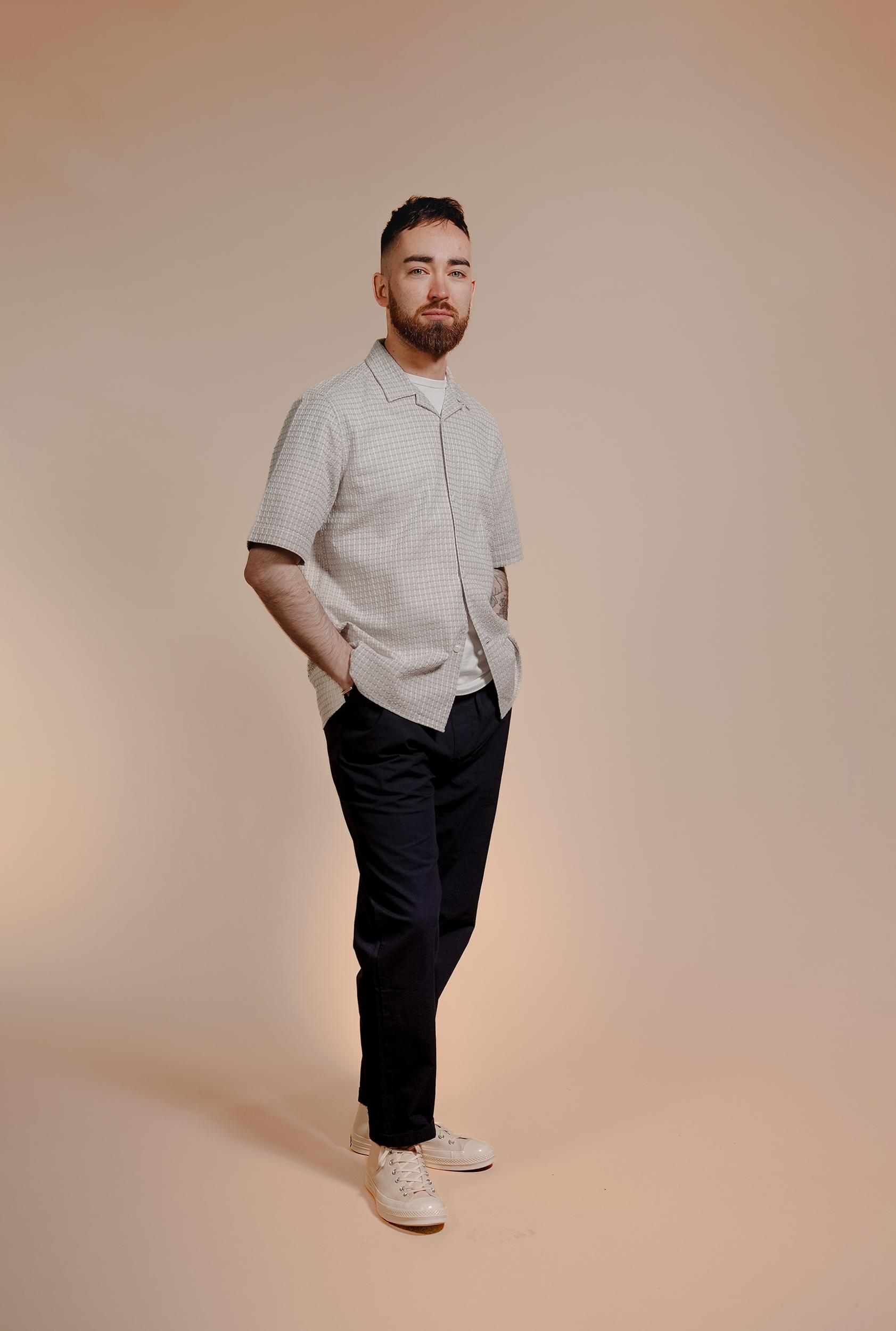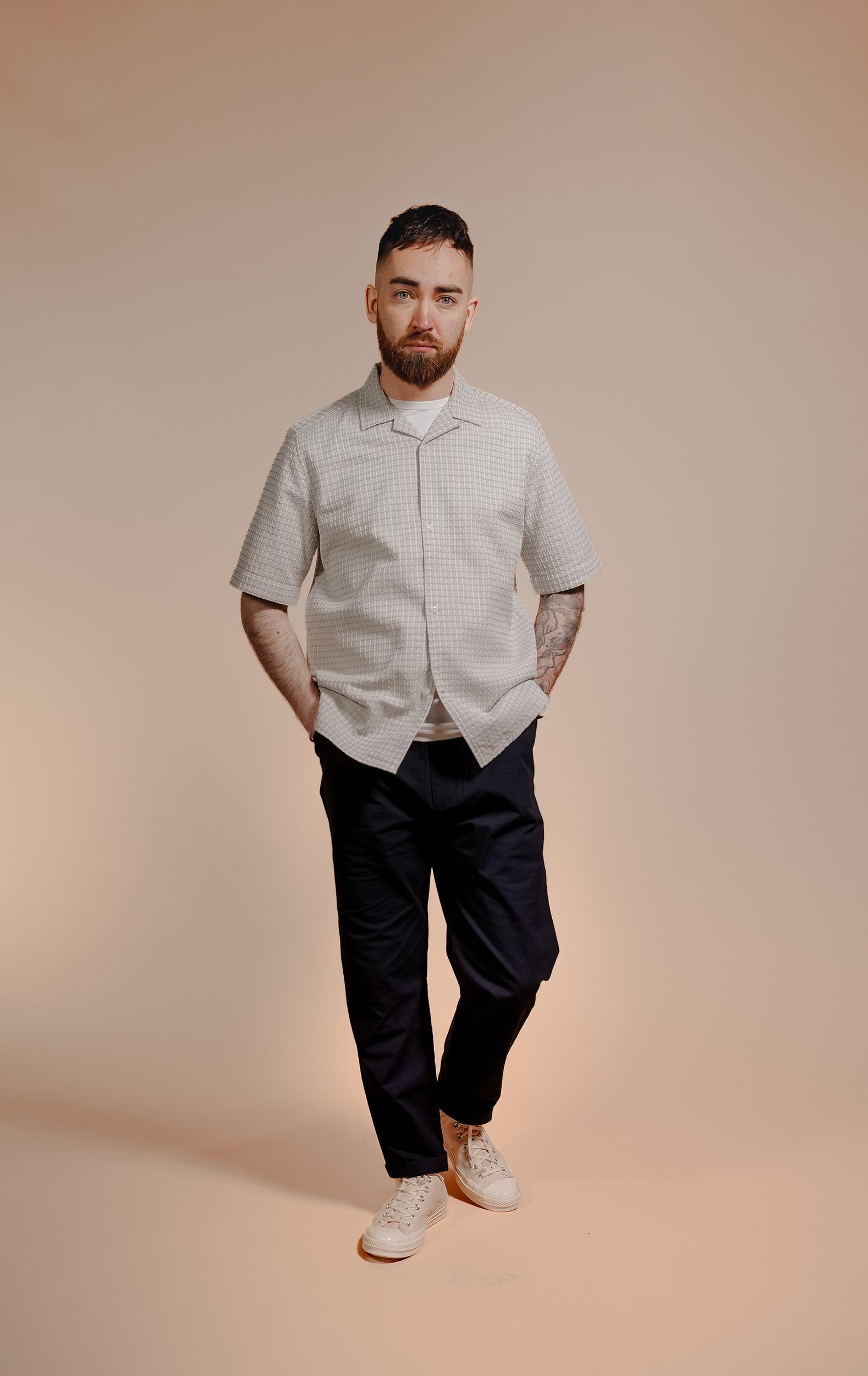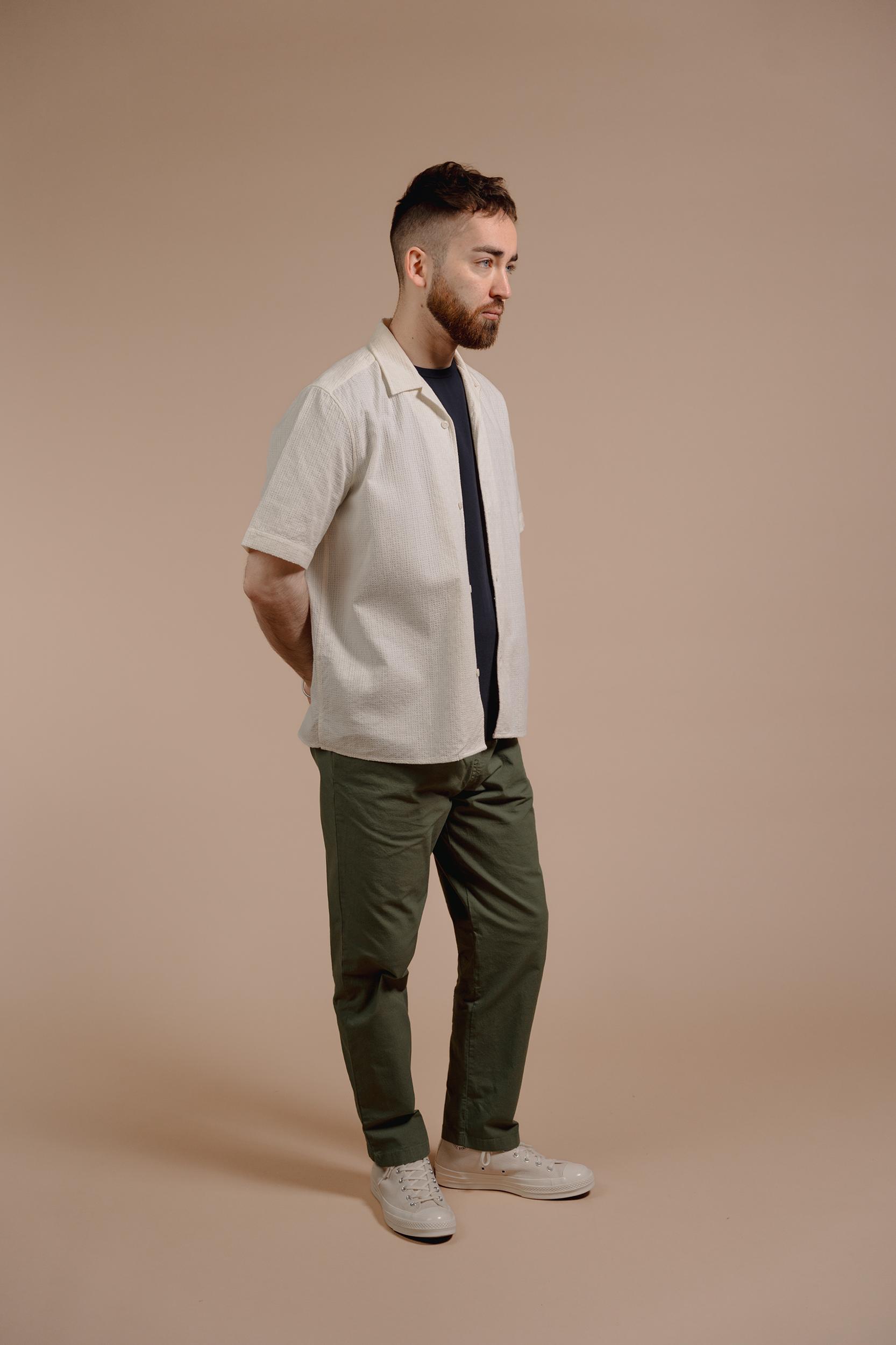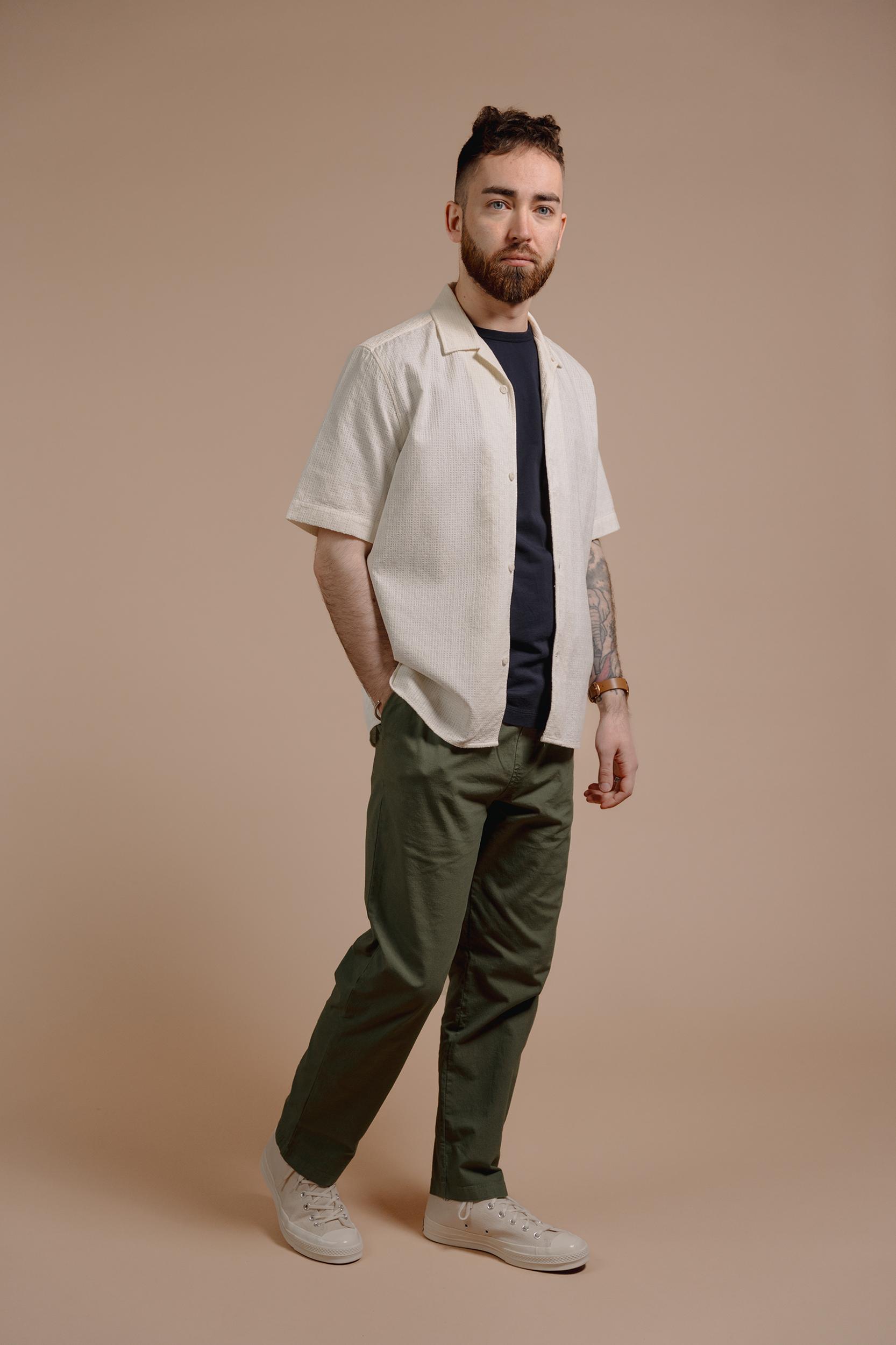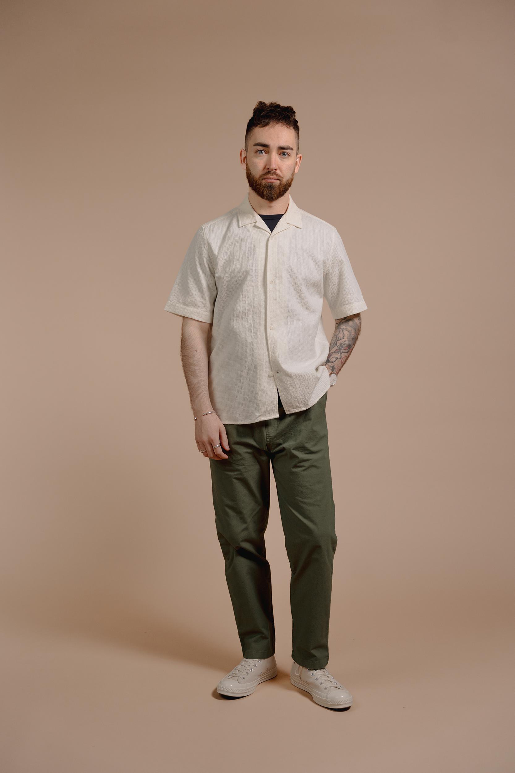 The Short Sleeve Cabin Shirt is a relaxed style, cut in a shape that is straight through the body. Crafted from a beautiful, mid-weight jacquard design from Portugal. Detailed with a camp collar and finished with sustainable, corozo nut buttons. Cut for a regular fit. Take you normal size.