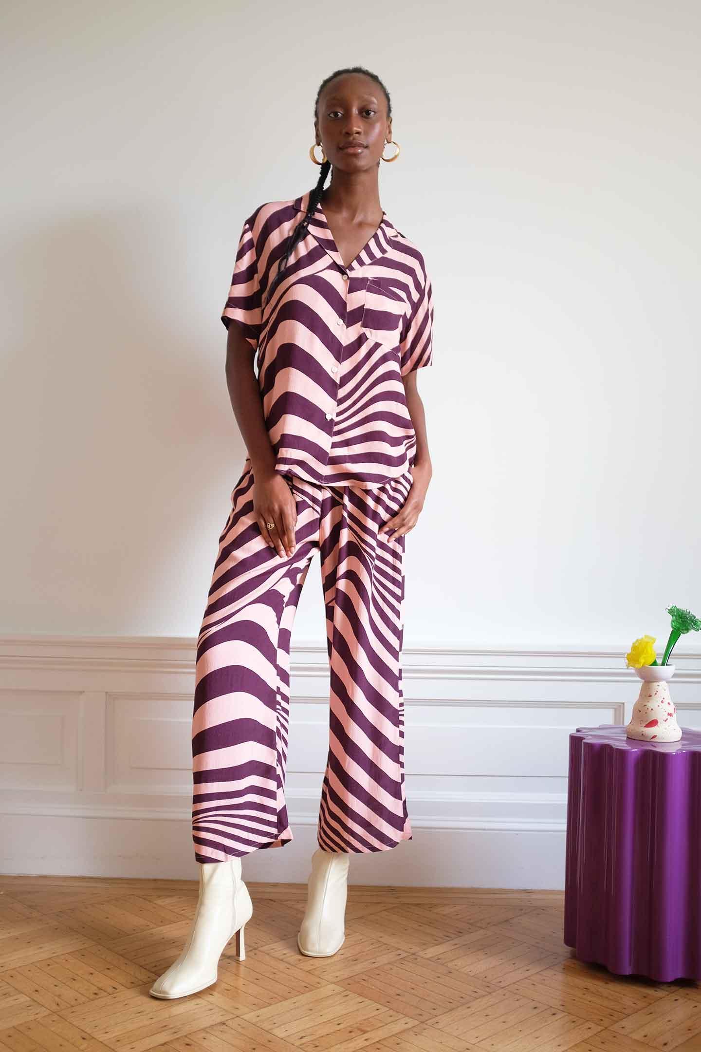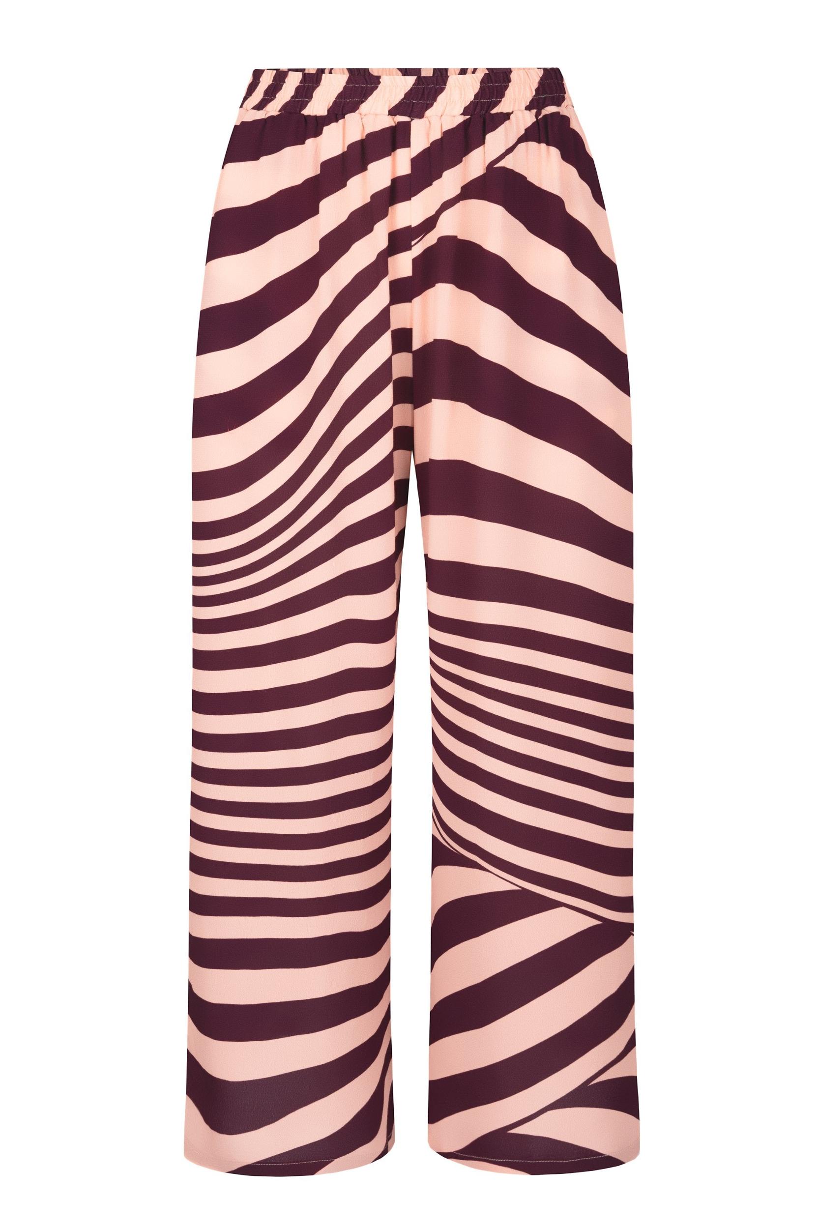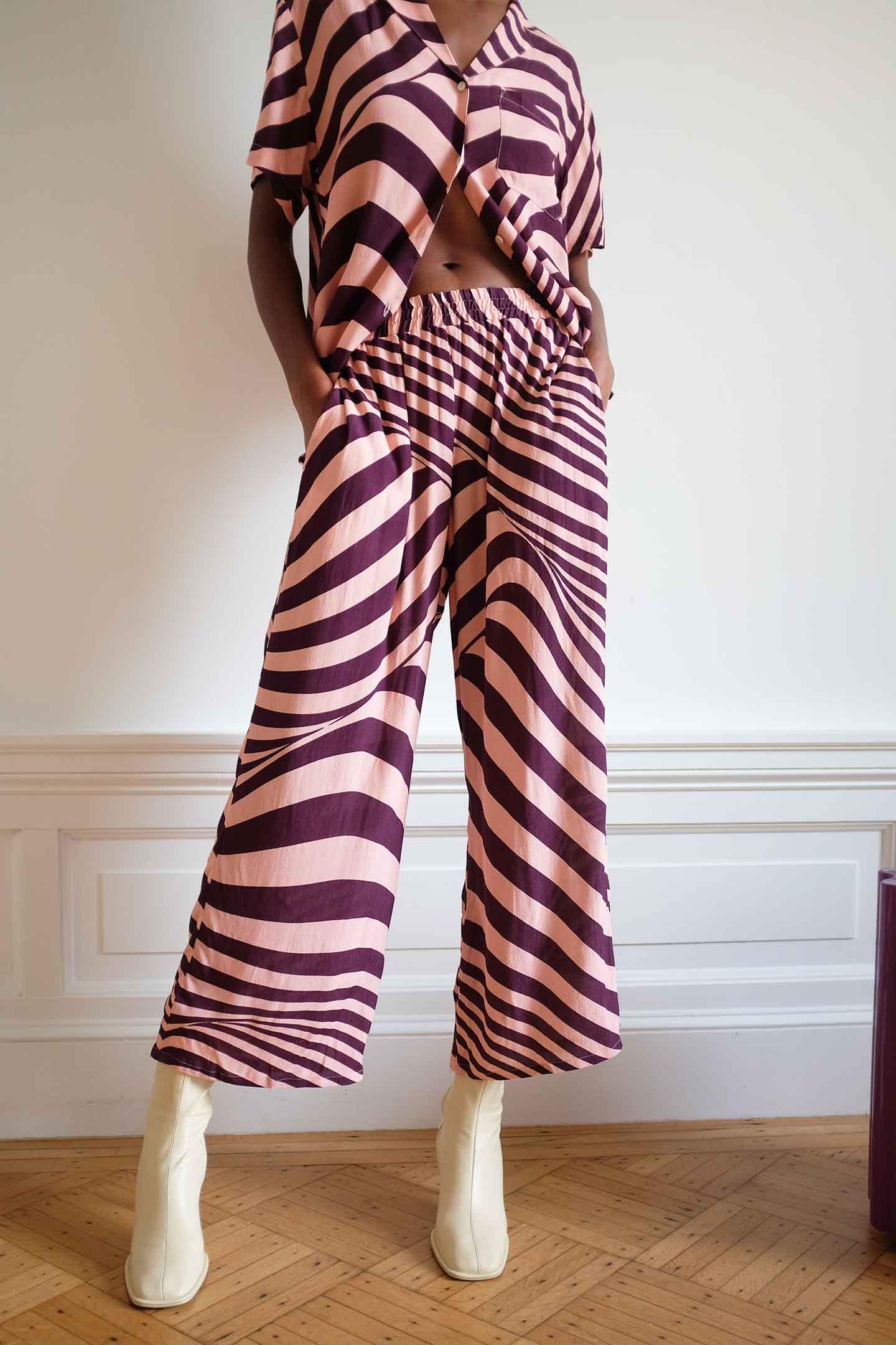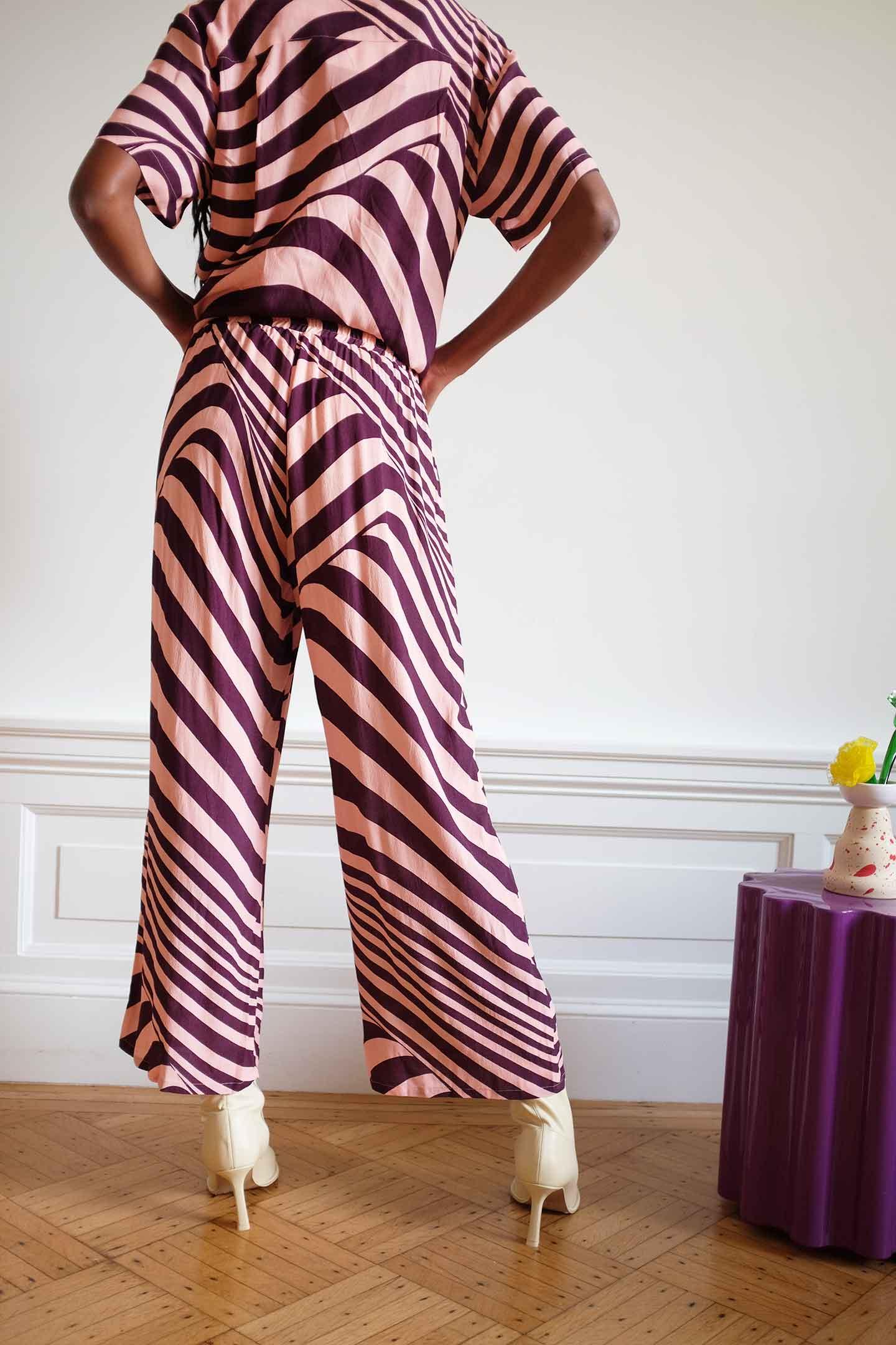 A versatile and comfortable pant with a wide leg fit, an elastic waistline and relaxed leg in our Berry Swirl print. FINAL SALE Items marked as final sale cannot be returned. Final sale items are not eligible for store credit, exchange, refunds, or exceptions. True to size Danielle is 6'0" with a 33" bust, 26" waist and 34" hip and is wearing a size S. Lynley is 5'4" with a 38" bust, 39" waist and 53" hip and is wearing size 2XL. 72% rayon 28% viscose Hand wash or dry clean Made in a fair trade factory in Shanghai; Designed and developed in NYC.