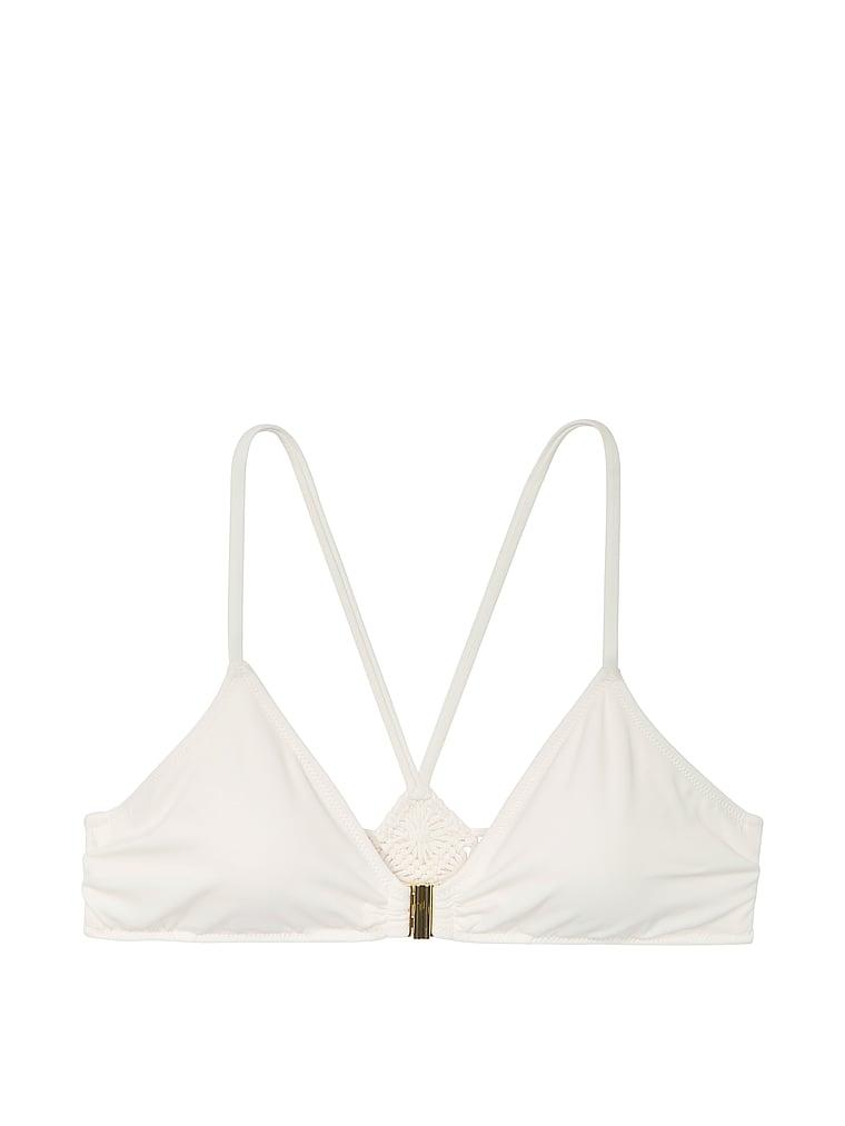 Emerge from the ocean or sunbathe in the sand in Swimwear with an upscale, handcrafted vibe. Intricate macrame detail adds texture and interest to this strappy-back Bralette design.VS Archives Swim: Discover iconic suits inspired by exclusive silhouettes from the early 2000s. Strappy racerback with macrame trim Lightly lined with removable padding Wireless Gold-tone front closure with hook clasp Partially made from recycled materials Hand wash Imported