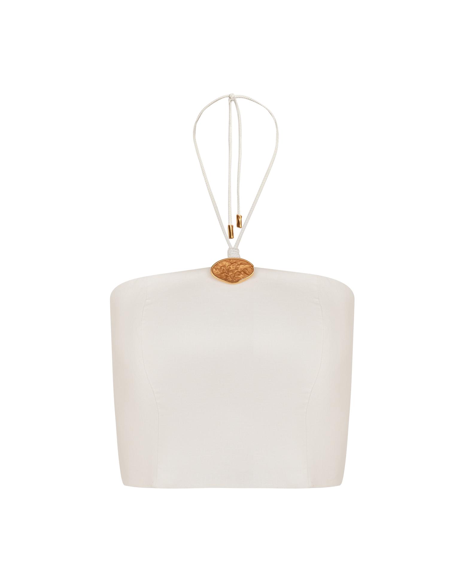 The ViX Arden Halter Top is a sleeveless halter silhouette highlighted by the signature Petra detail — a gold-tone resin medallion. Designed with a smocked back for comfort and support, it features adjustable neck ties and a back zipper closure. Style the Arden Halter Top with a matching skirt or pair of pants and sandals for a resort-ready look. Features: Halter top Sleeveless Petra detail at bust Tie closures at neck Smocked back Back zipper closure Style# VG262073