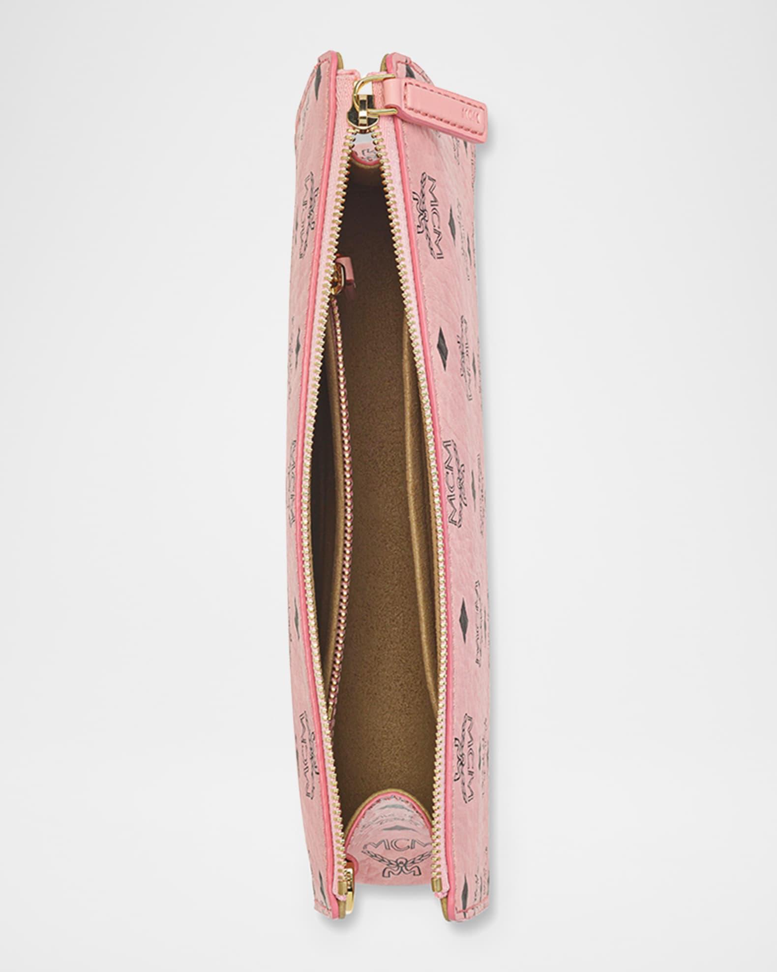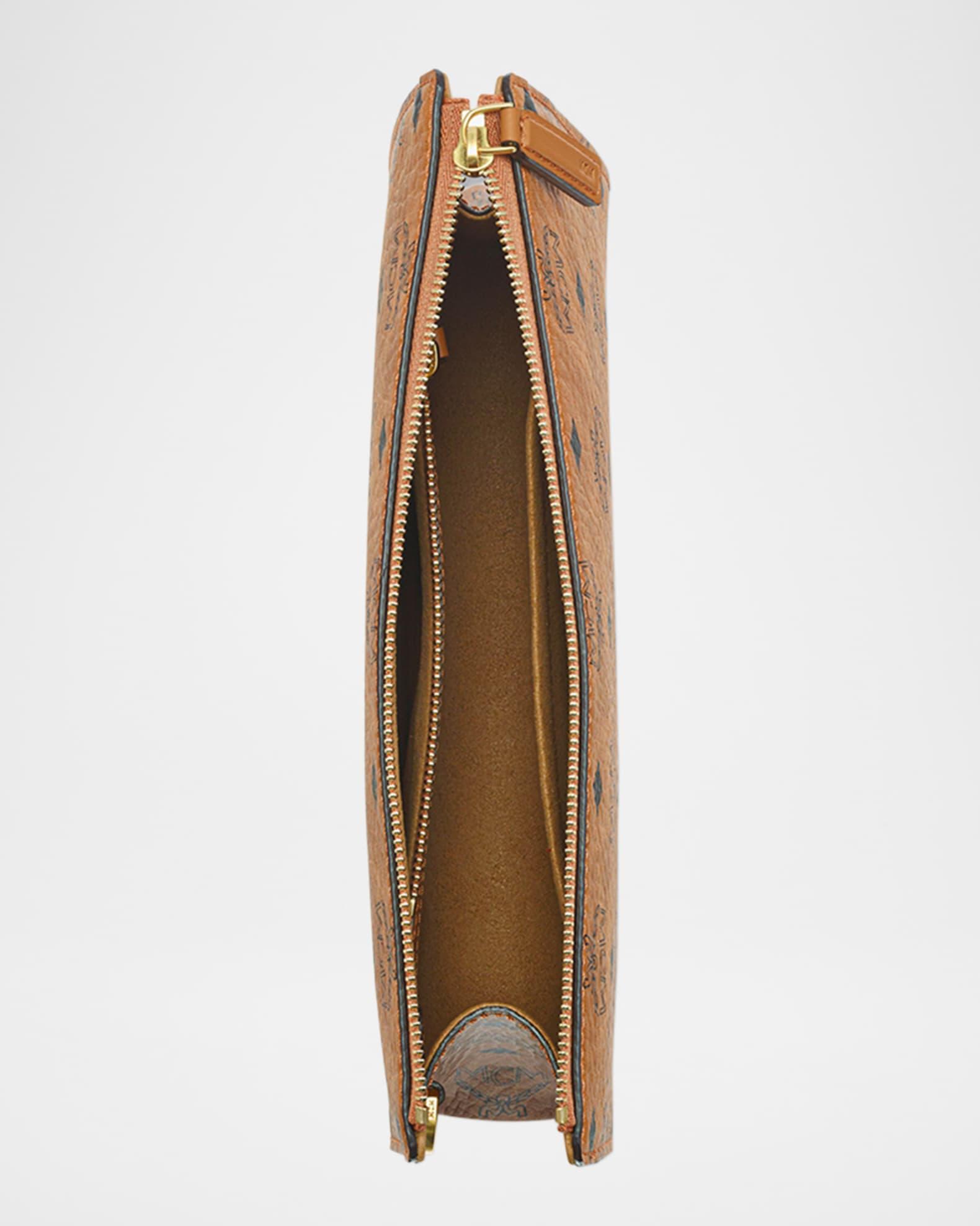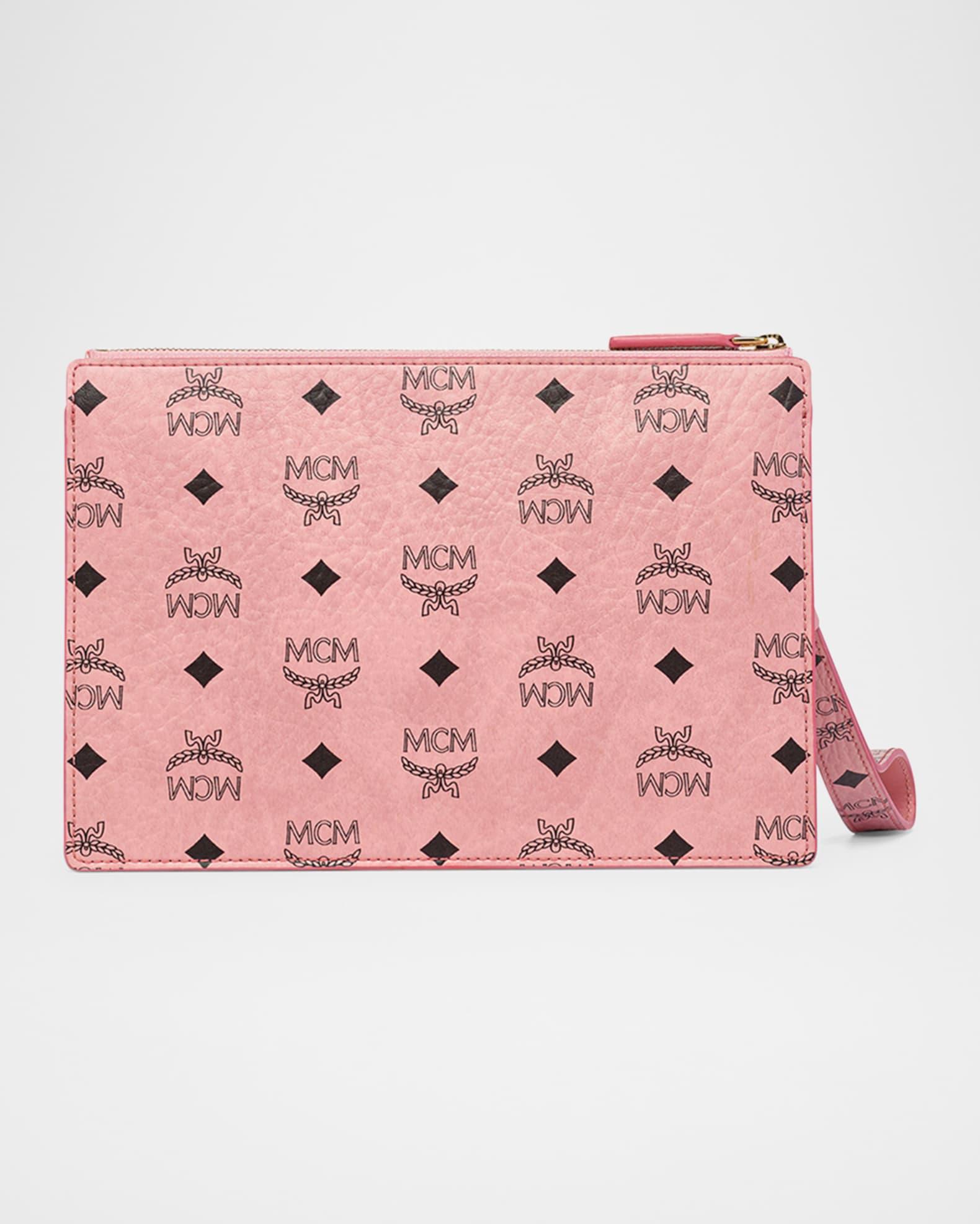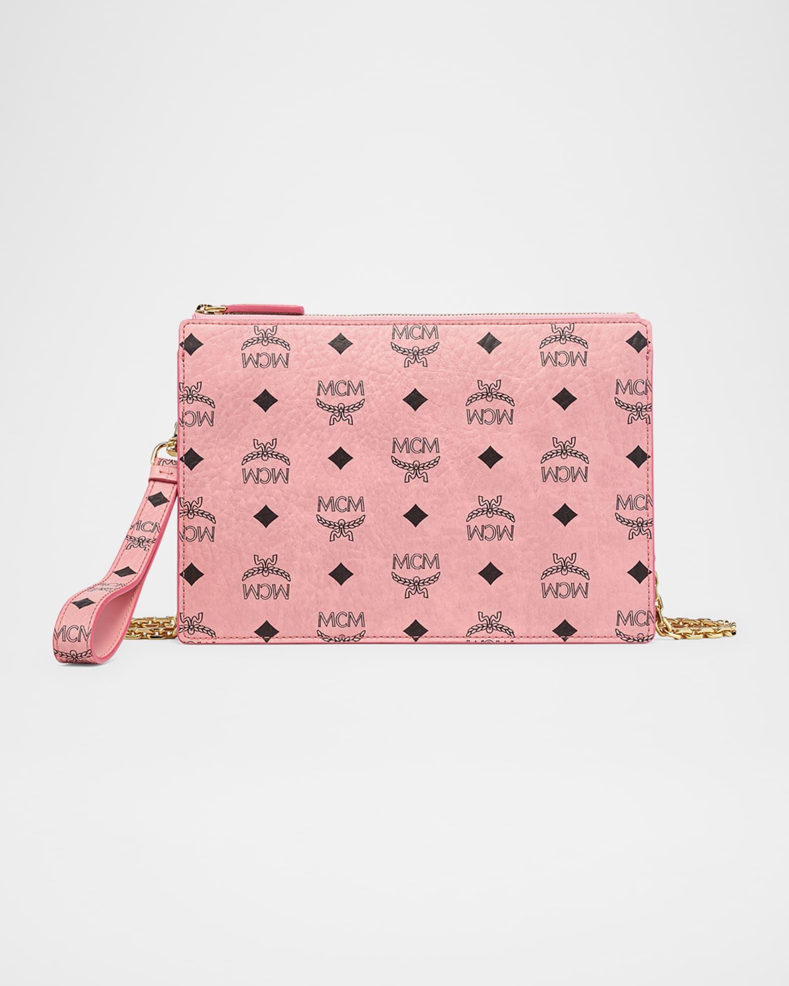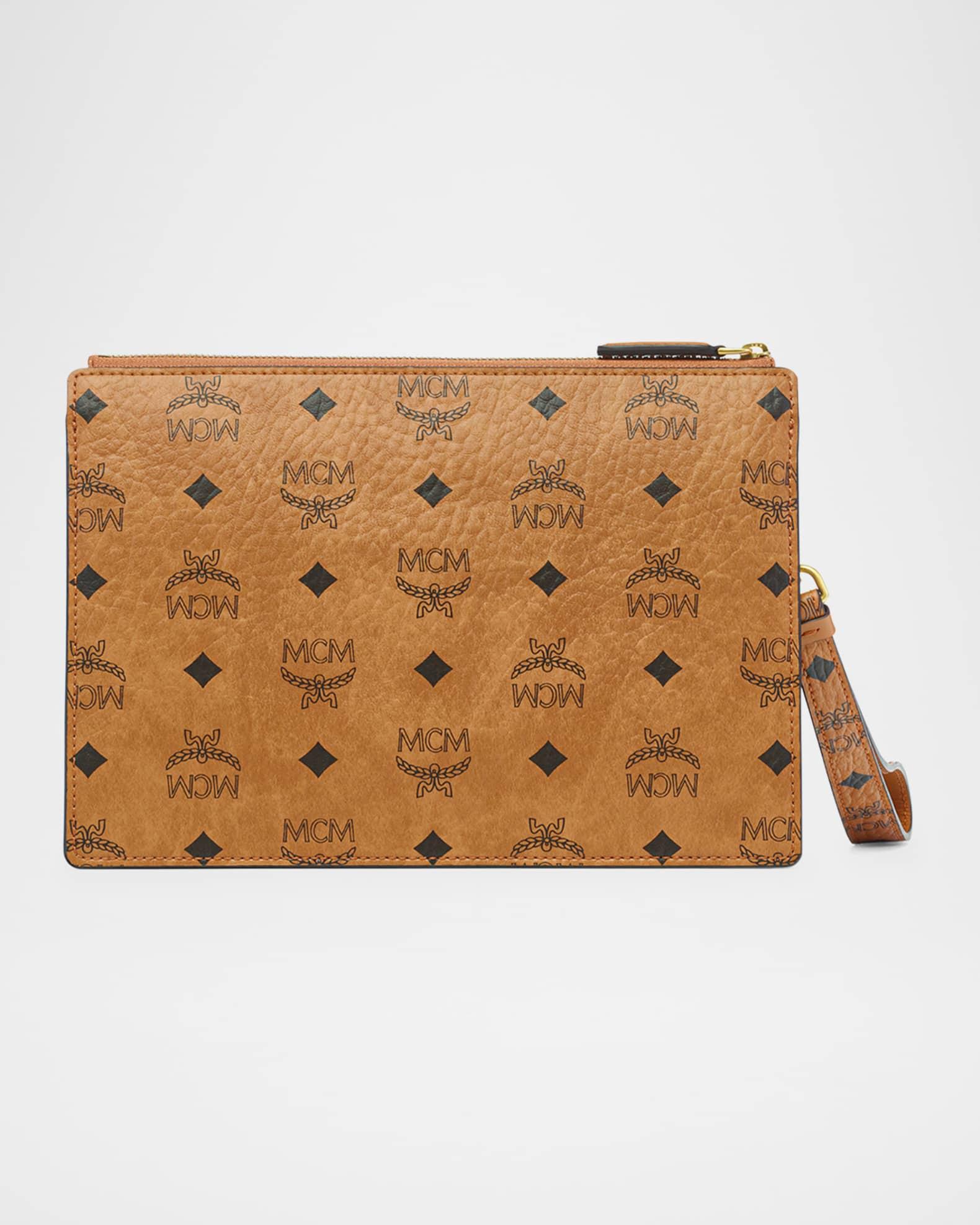 MCM "Aren" pouch bag in signature Visetos coated faux leather (polyurethane) Zip top Detachable wrist strap Gold-plated chain handle strap Interior zip and open pocket Trim: Leather Lining: Cotton Approx. 8.7"H x 11.8"W x 1"D Spot clean Imported