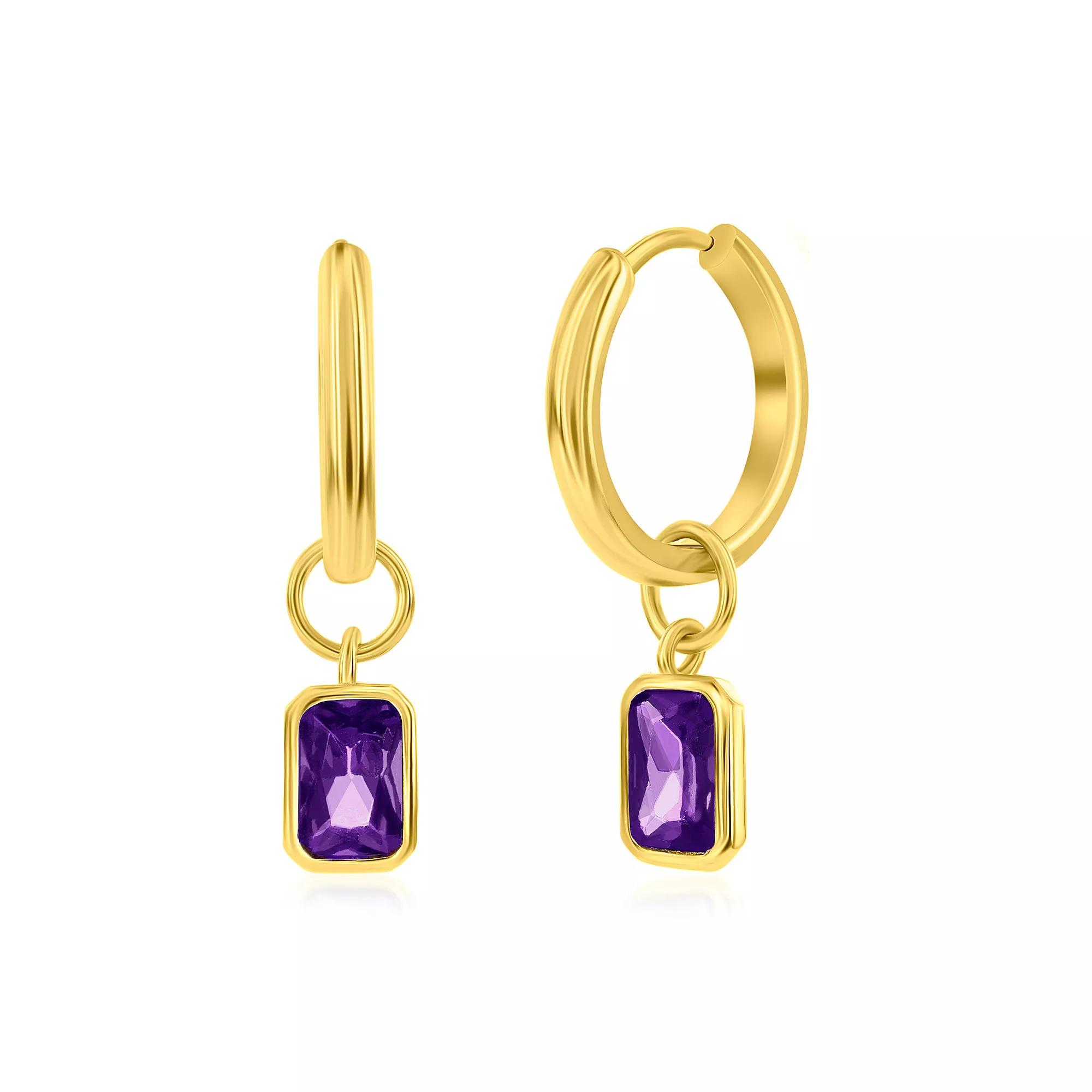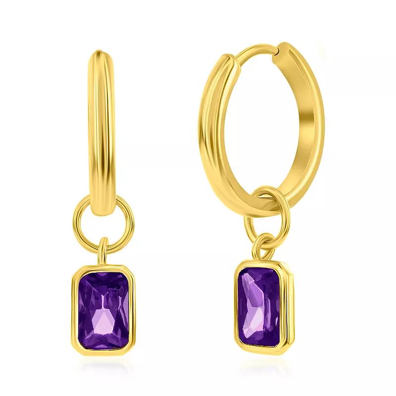 Add a touch of sparkle to your look with these dyed birthstone cubic zirconia Argento Bella gold tone sterling silver drop hoop earrings. Click on this JEWELRY & WATCHES GUIDE to learn about fit, styles, materials and more! Add a touch of sparkle to your look with these dyed birthstone cubic zirconia Argento Bella gold tone sterling silver drop hoop earrings. Click on this JEWELRY & WATCHES GUIDE to learn about fit, styles, materials and more! FEATURES Length: 25 mm Backings: click-it Nickel free Metal: sterling silver Plating: gold tone Finish: polished Packaging: boxedSTONE DETAILS Stone type: cubic zirconia Shape: rectangle Setting: bezel Gemstones may have been treated to enhance their appearance. Special care may be required. Please visit our Gemstone Treatment & Special Care Guide for more information. Size: One Size. Color: Purple. Gender: female. Age Group: adult. Material: Gold Over Sterling.