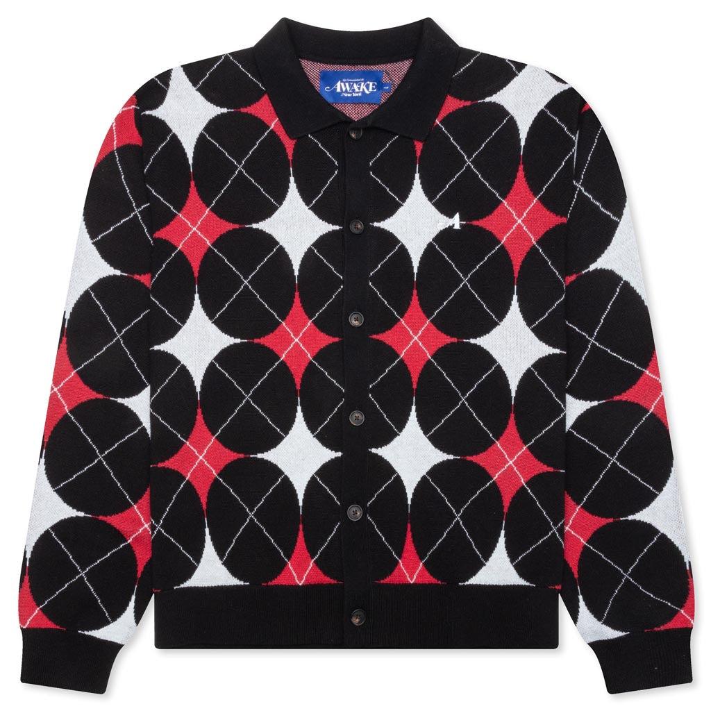 The Awake NY Arglye Knit Cardigan makes an impression on any collection. The design features a Argyle pattern that is treated with a button closure and pointed collar. The rib-knit detailing and embroidered 'A' offers a finishing touch. Cotton blend Front button closure Embroidered detail Argyle pattern Rib-knit trims Style No: AWK-SP24-KN002-BLK