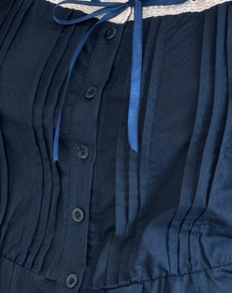The Arhan top, in navy poplin this top features a sleeveless design with square neckline and white ribbon trim. Paired with our Ritala Hot Pants. MODEL WEARS SIZE:EXTRA SMALL - MODEL HEIGHT:5'7