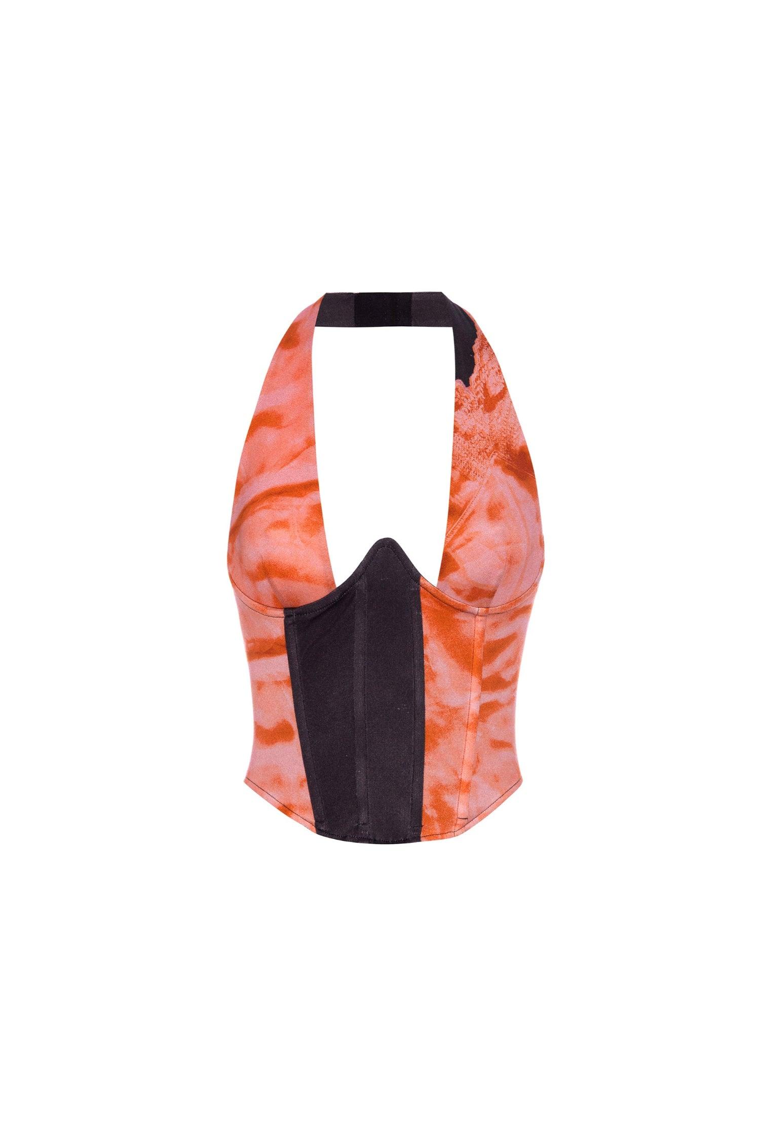 As seen on SZA. Our Ari Corset in Lingerie Print is from our HO23 collection. This fully boned halter corset features a back zipper to hug your body just right. Cotton Jersey fabric: 95% Tencel, 5% Spandex
