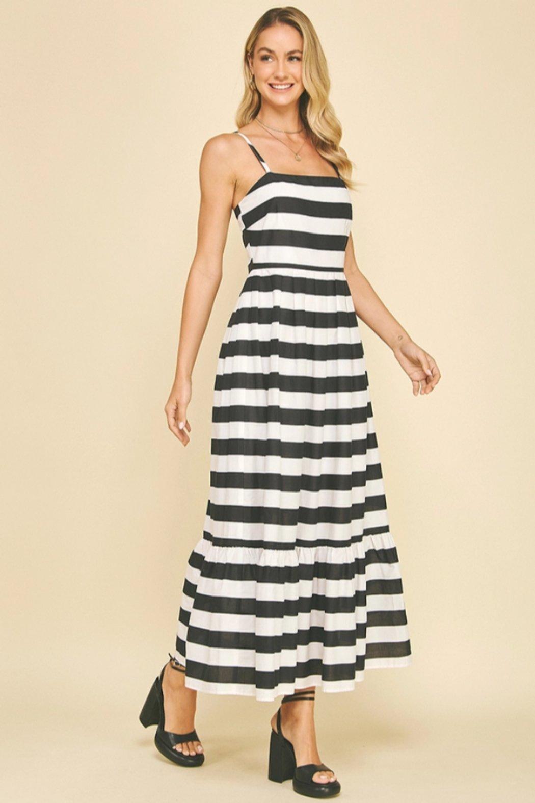 This classic striped maxi dress features bold black and white horizontal stripes that create a timeless, nautical-inspired look. Made from 100% cotton for breathable comfort, the dress showcases thin adjustable spaghetti straps and a fitted bodice that flows into a graceful tiered maxi skirt with a subtle ruffle hem. The clean lines and monochromatic palette make this versatile piece perfect for everything from casual beach days to summer evenings out.