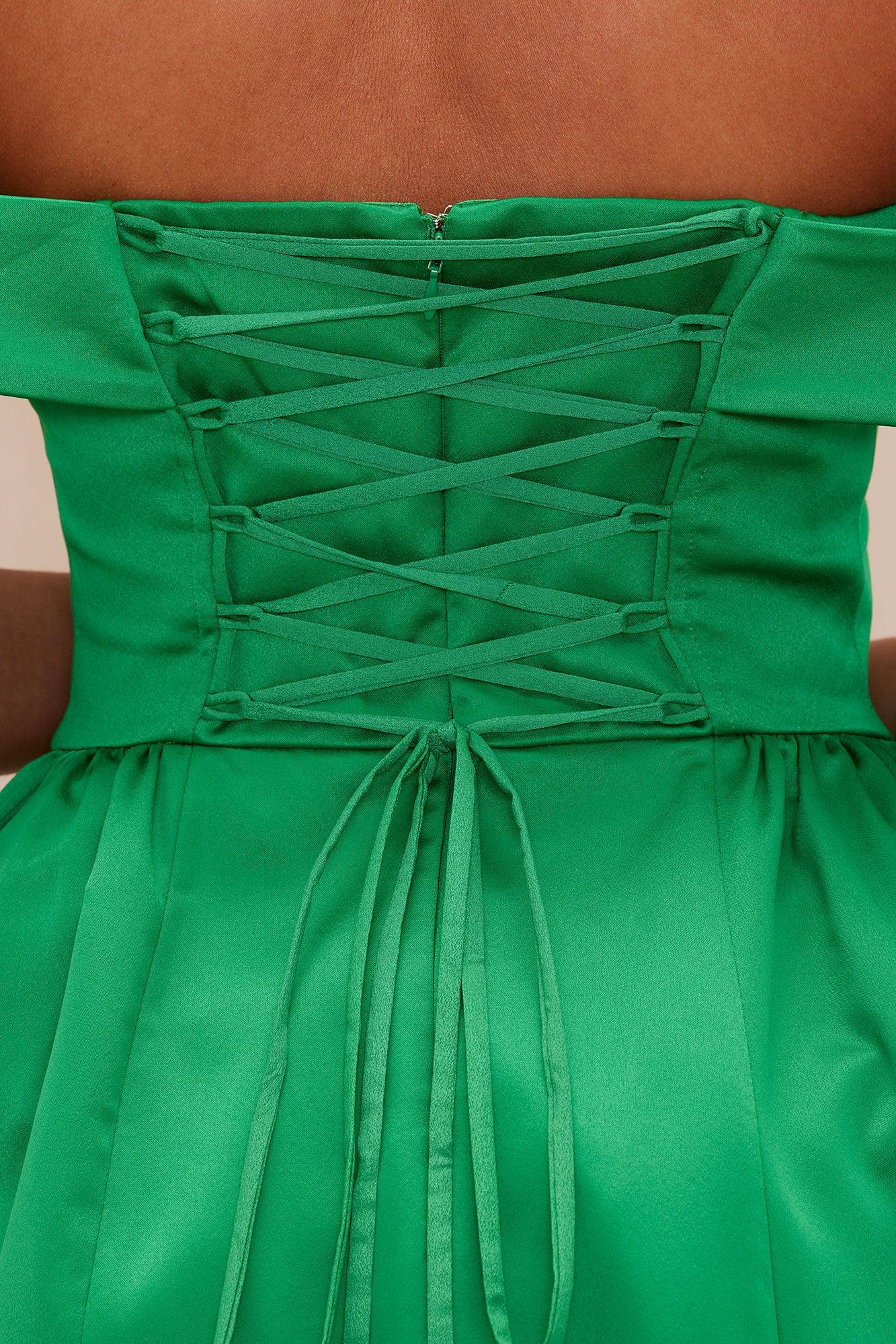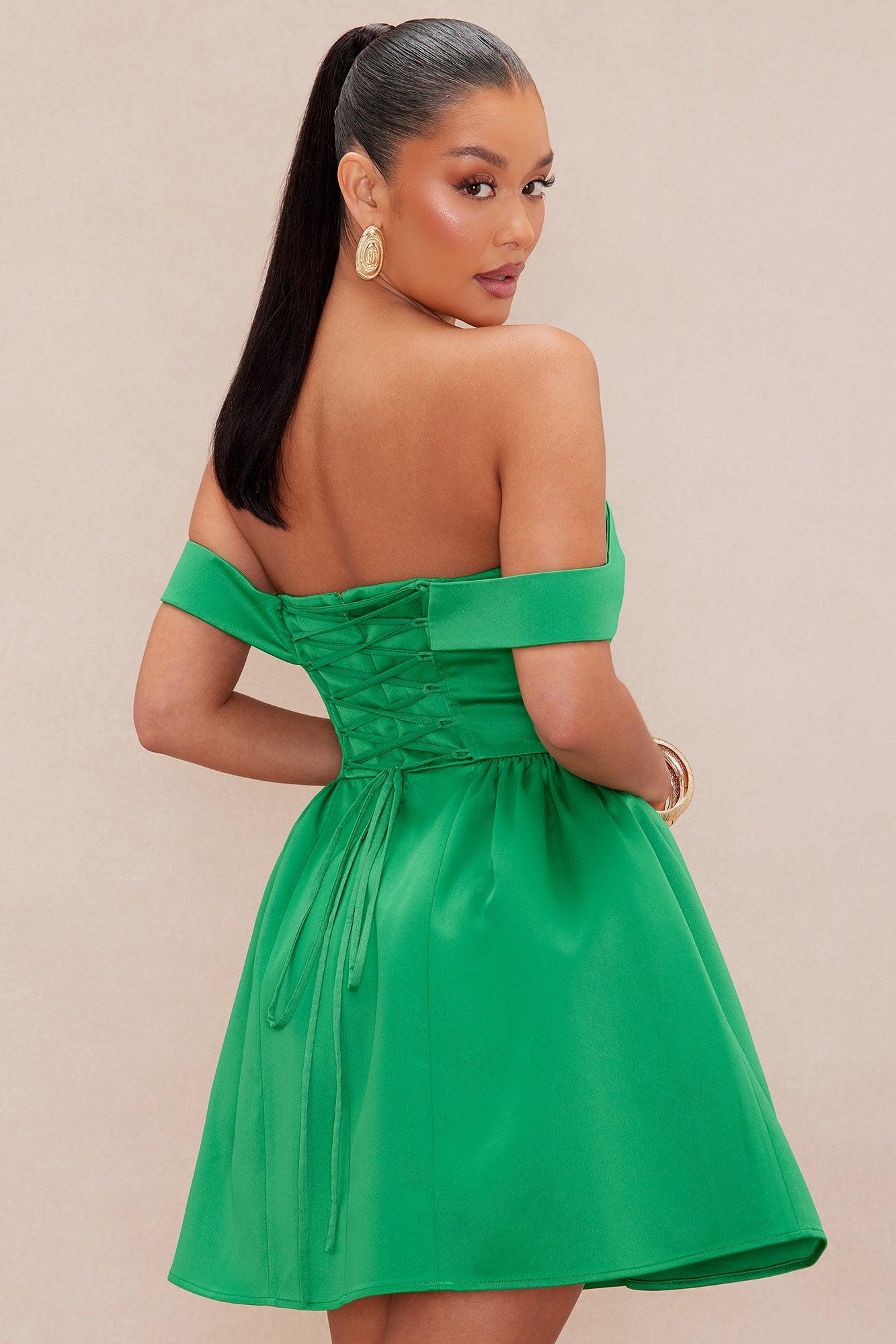 Available In Pink And Kelly Green. Satin Mini Dress Off Shoulder Padded Bra Cups Grip Tape Bubble Hem Lace Up Back Zipper Closure Lined Non Stretch Length= 27'' Shell: 96% Polyester 4% Spandex Lining1: 95% Polyester 5% Spandex Lining2: 100% Polyester Imported