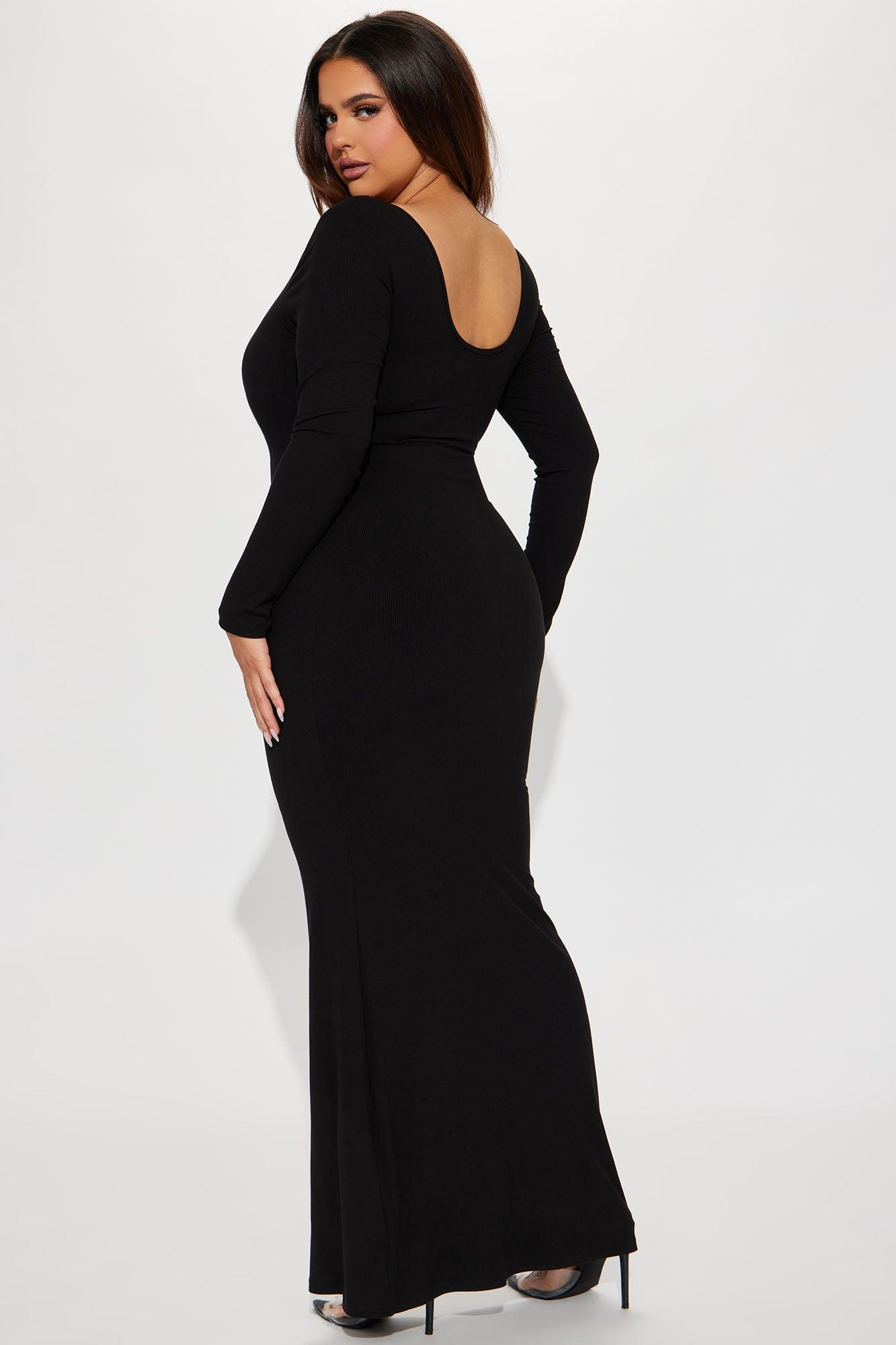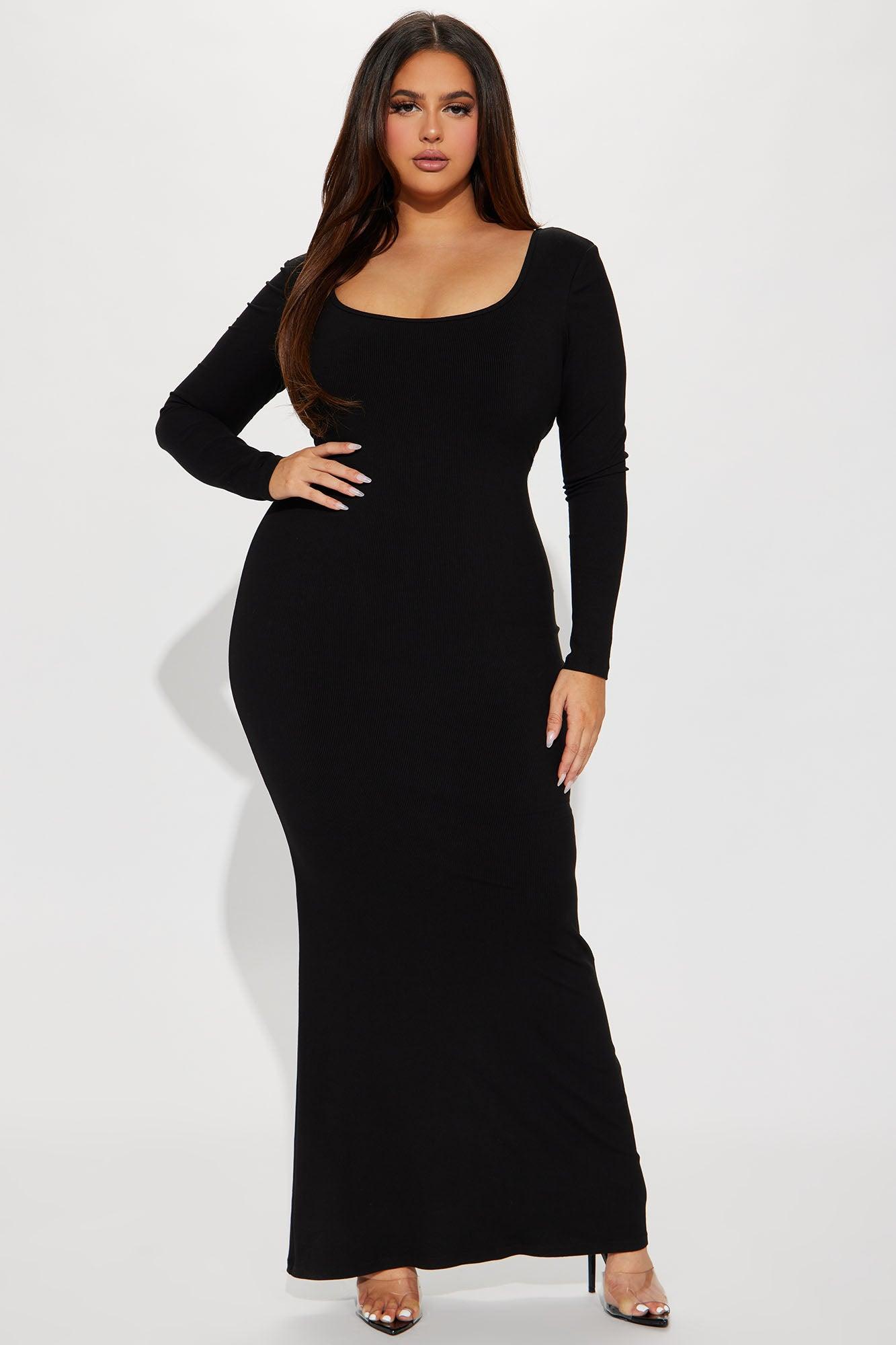 Available In Black. Ribbed Maxi Dress Long Sleeves Scoop Neck Padded Bra Cups Undergarment Shapewear Lining Stretch Final Sale Shell: 92% Cotton 8% Spandex Lining: 72% Nylon 28% Spandex Imported