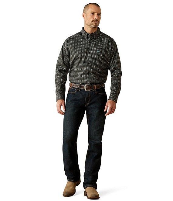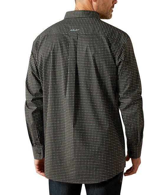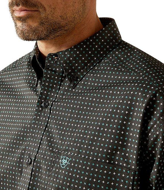 From Ariat, this shirt features: Allover print Button front collar Long sleeves Adjustable cuffs with extended button detail make it easier to roll up your sleeves Button-front closure Single patch pocket Ariat branding details Hidden pen slot in the left pocket Generous fit, with extra length in the body and sleeves that keeps you covered while you're on the move Woven cotton Machine wash/tumble dry Imported.