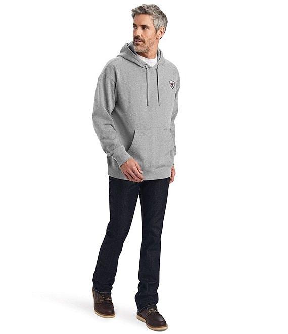 From Ariat, this hoodie features: Super-soft fleece fabric Jersey-lined hood Long sleeves (one with "Ariat" logo detail) Icon logo detail on the chest Front kangaroo pocket Cotton/polyester super-soft fleece Machine wash/tumble dry Imported.