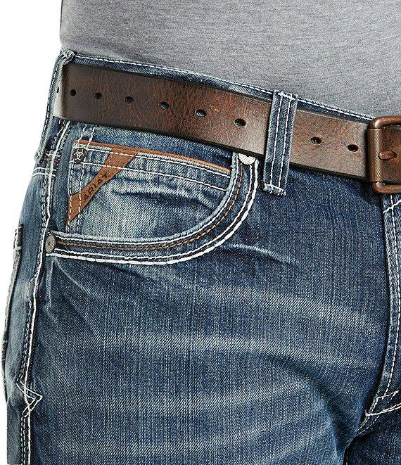 From Ariat, these jeans feature: 13.25 oz ring-spun denim Anchored belt loops No-rub comfort inseam Heavy-duty zippers and hardware Extra deep front pockets Relaxed through the waist, hip, and thigh Sits lower on the waist Classic boot cut Cotton Machine wash cold/tumble dry Imported.