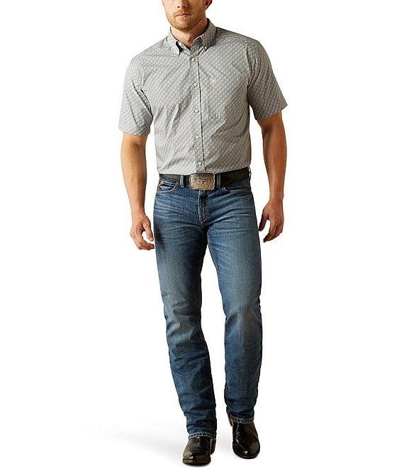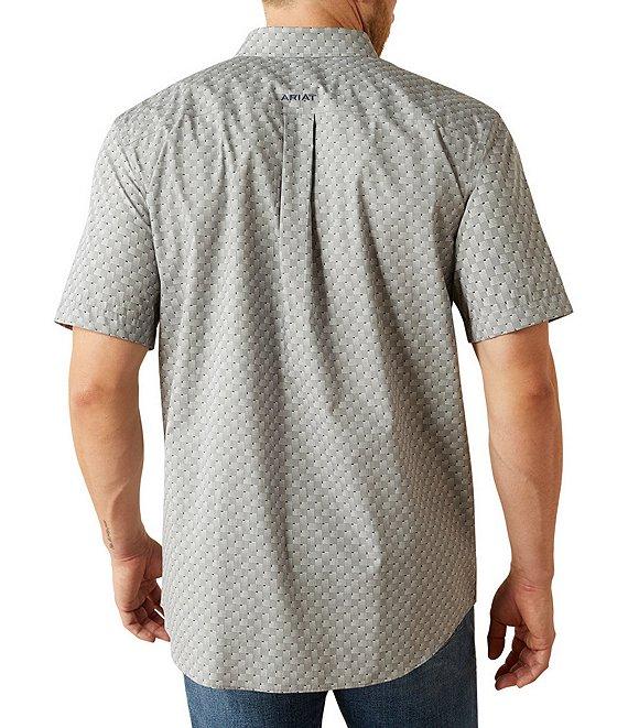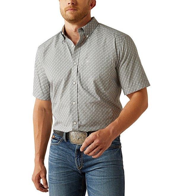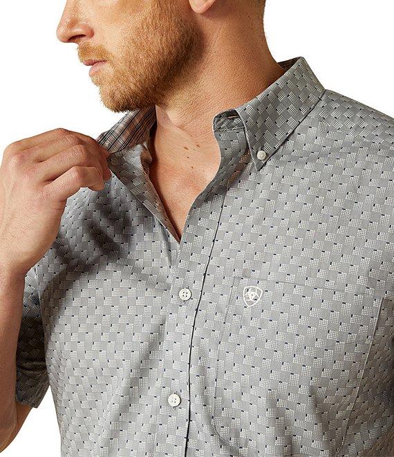 From Ariat, this shirt features: Classic fit Button-down collar Short sleeves Adjustable cuffs with extended button detail make it easier to roll up your sleeves Button-front closure Ariat branding details Hidden pen slot in left pocket Generous fit, with extra length in the body and sleeves Wrinkle-free finish Taped seams for added protection against wrinkles Woven cotton Machine wash/tumble dry Imported.