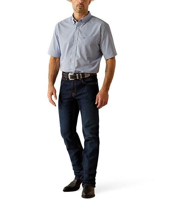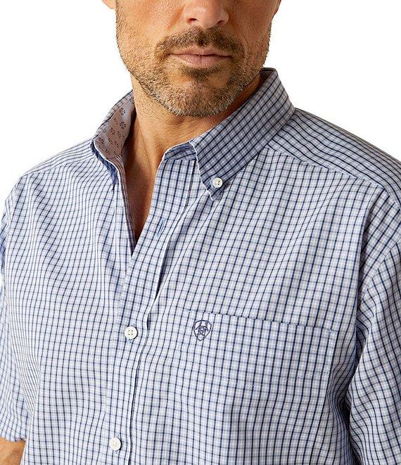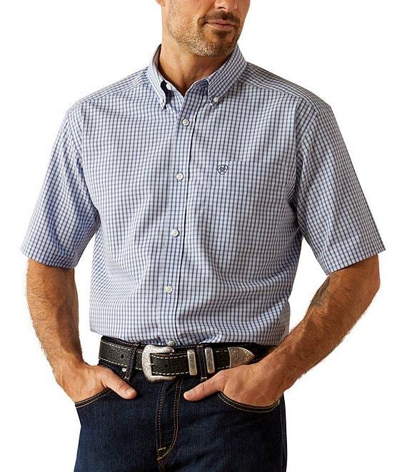 From Ariat, this shirt features: Allover print Classic style Button-down collar Short sleeves Adjustable cuffs with extended button detail makes it easier to roll up your sleeves Button-front closure Hidden pen slot in the left pocket Ariat branding details Generous fit with extra length in the body and sleeves Wrinkle free finish Taped seams for added protection against wrinkles Woven cotton Machine wash/tumble dry Imported.