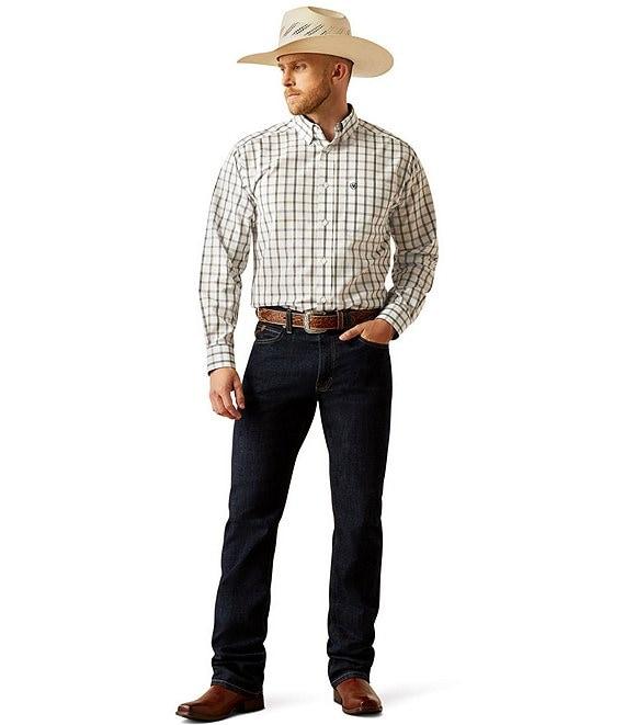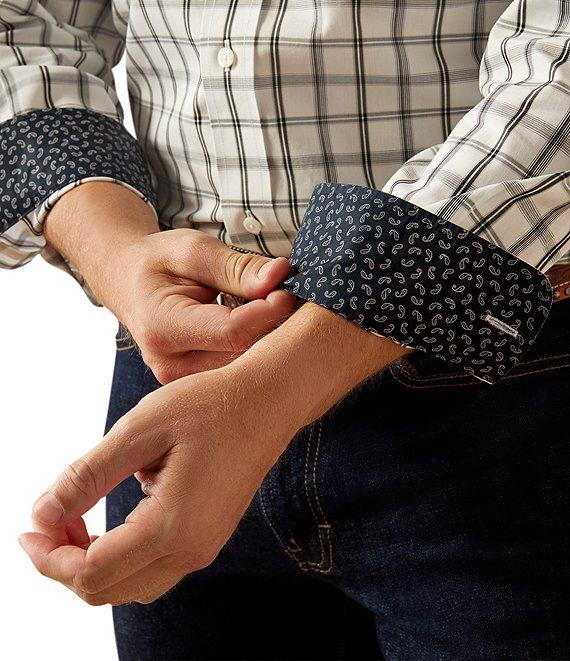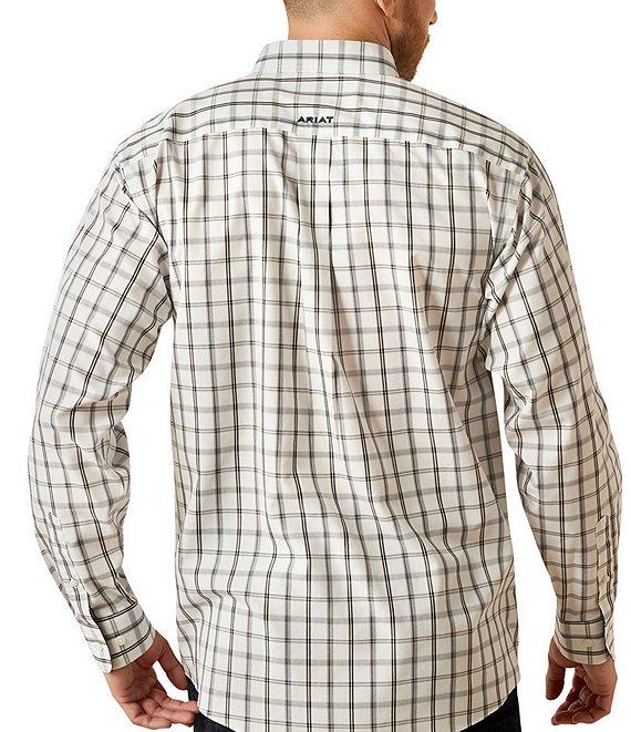 From Ariat, this shirt features; Button-down collar Long Sleeves Adjustable cuffs with extended button detail make it easier to roll up your sleeves Button-front closure Ariat branding details Hidden pen slot in the chest pocket Wrinkle free finish combined with taped seams for added protection against wrinkles Classic, comfortable and long lasting Cotton Machine wash/tumble dry Imported.