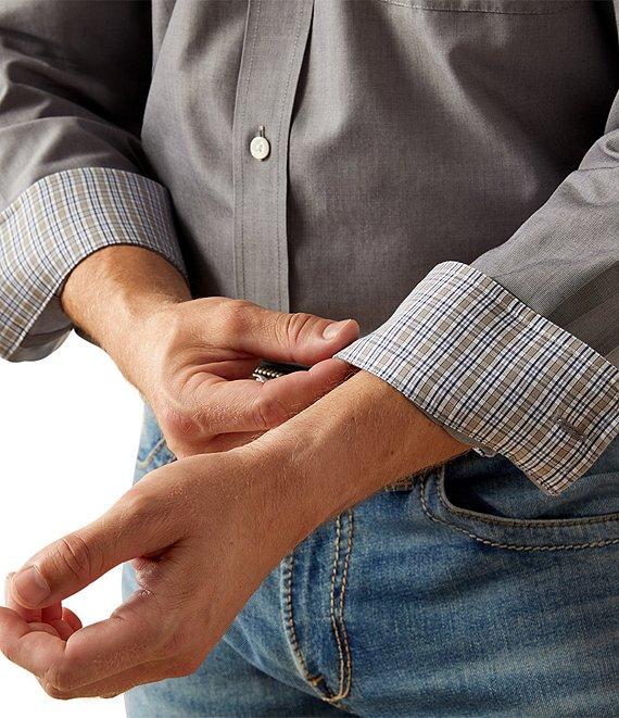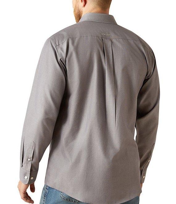 From Ariat, this shirt features: Button-down collar Long Sleeves Adjustable cuffs with extended button detail make it easier to roll up your sleeves Button-front closure Ariat branding details Hidden pen slot in the chest pocket Wrinkle free finish combined with taped seams for added protection against wrinkles Generous fit, with extra length in the body and sleeves that keeps you covered while you're on the move Cotton Machine wash/tumble dry Imported.