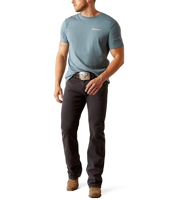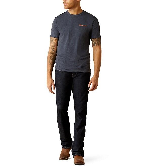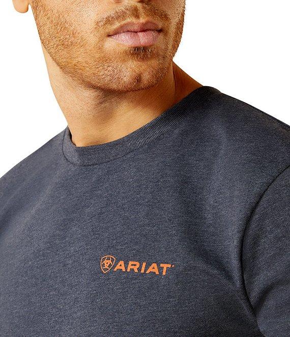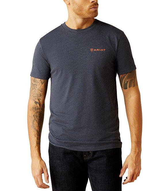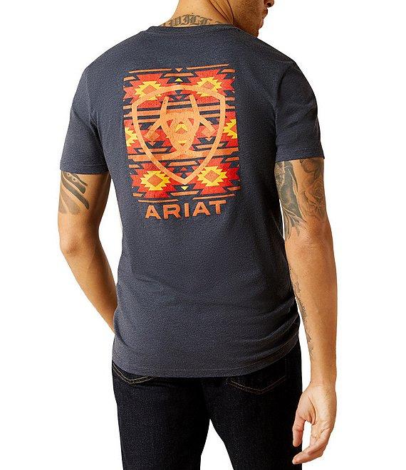 From Ariat, this T-shirt features: Easy fit, that’s perfect for everyday wear Crew neckline Short sleeves Small Ariat logo and icon logo detail on the left side of the chest Southwestern-inspired graphic and Ariat logo on the back Pullover construction Cotton Machine wash/tumble dry Imported.