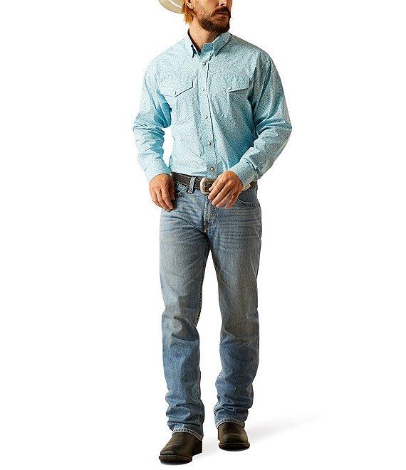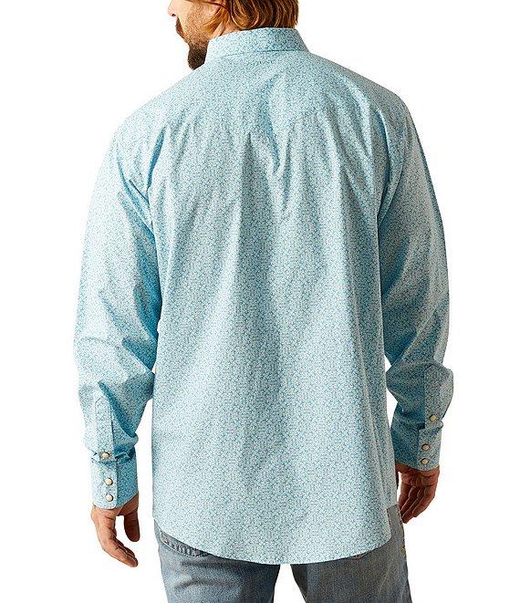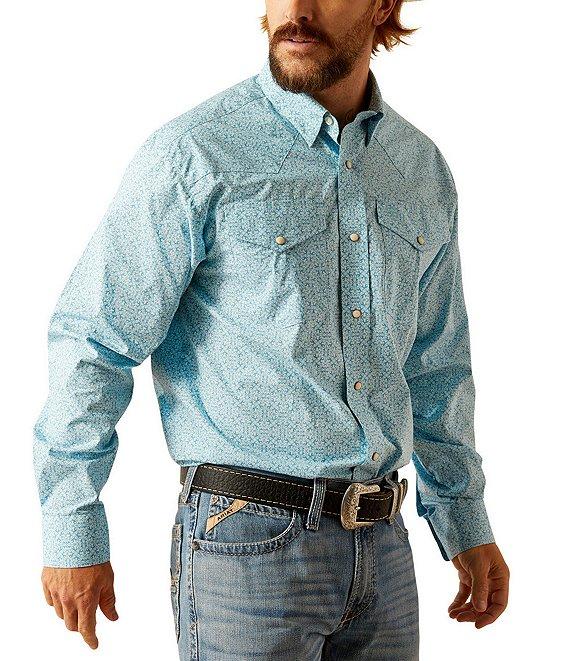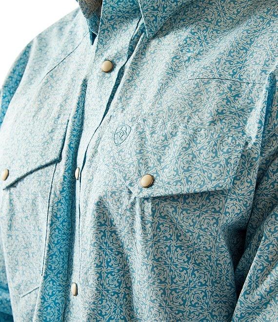 From Ariat, this shirt features: Point collar Long sleeves Adjustable cuffs with extended snap detail Snap-front closure Two snap-flap pockets Generous fit with extra length for tucking and reaching Classic styling, rugged comfort and quality construction Woven cotton Machine wash/tumble dry Imported.
