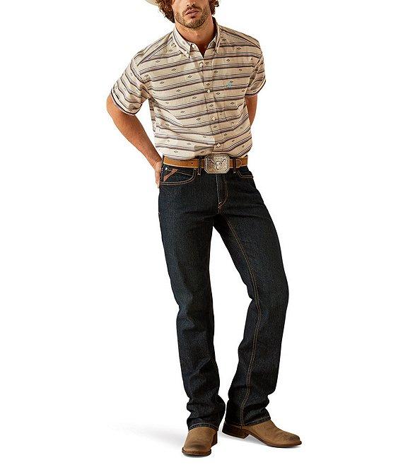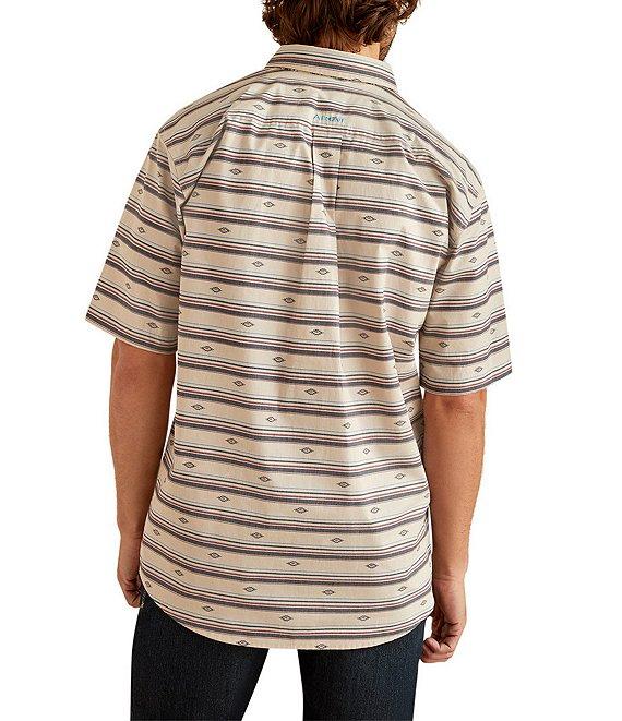 From Ariat, this shirt features:Allover printClassic stylingButton-down collarShort sleevesAdjustable cuffs with extended button detail make it easier to roll up your sleevesButton-front closureAriat branding detailsHidden pen slot in left pocketGenerous fit with extra length in the body and sleevesWoven cottonMachine wash/tumble dryImported.