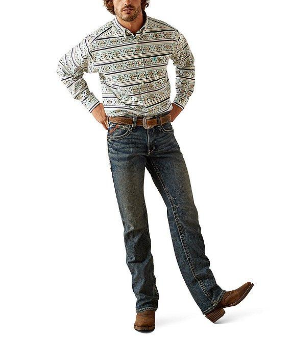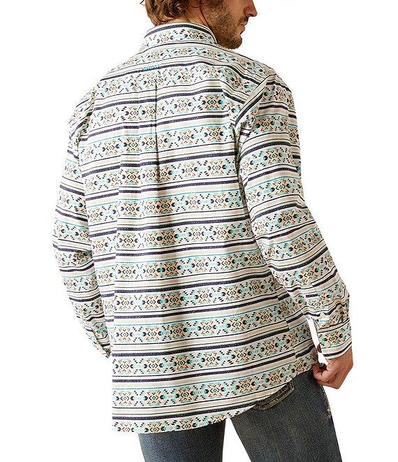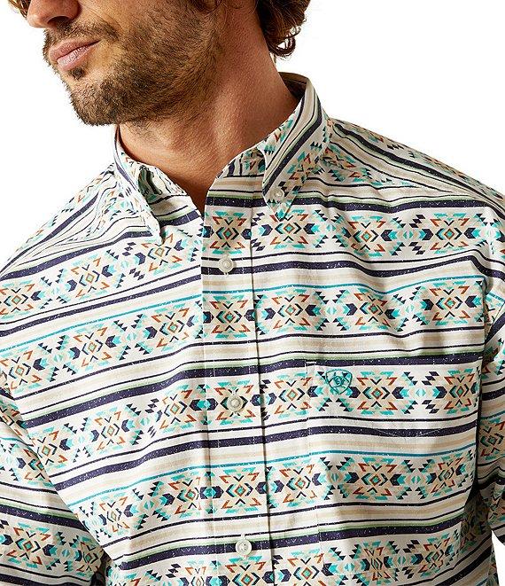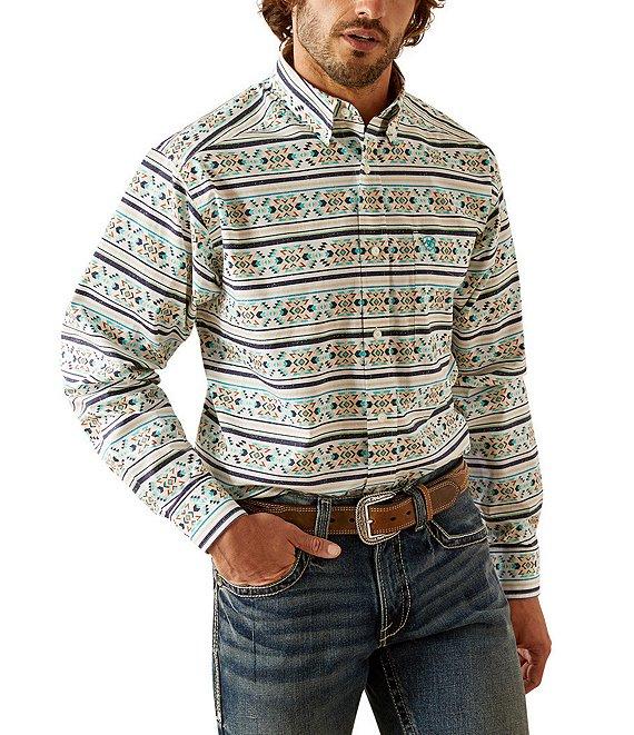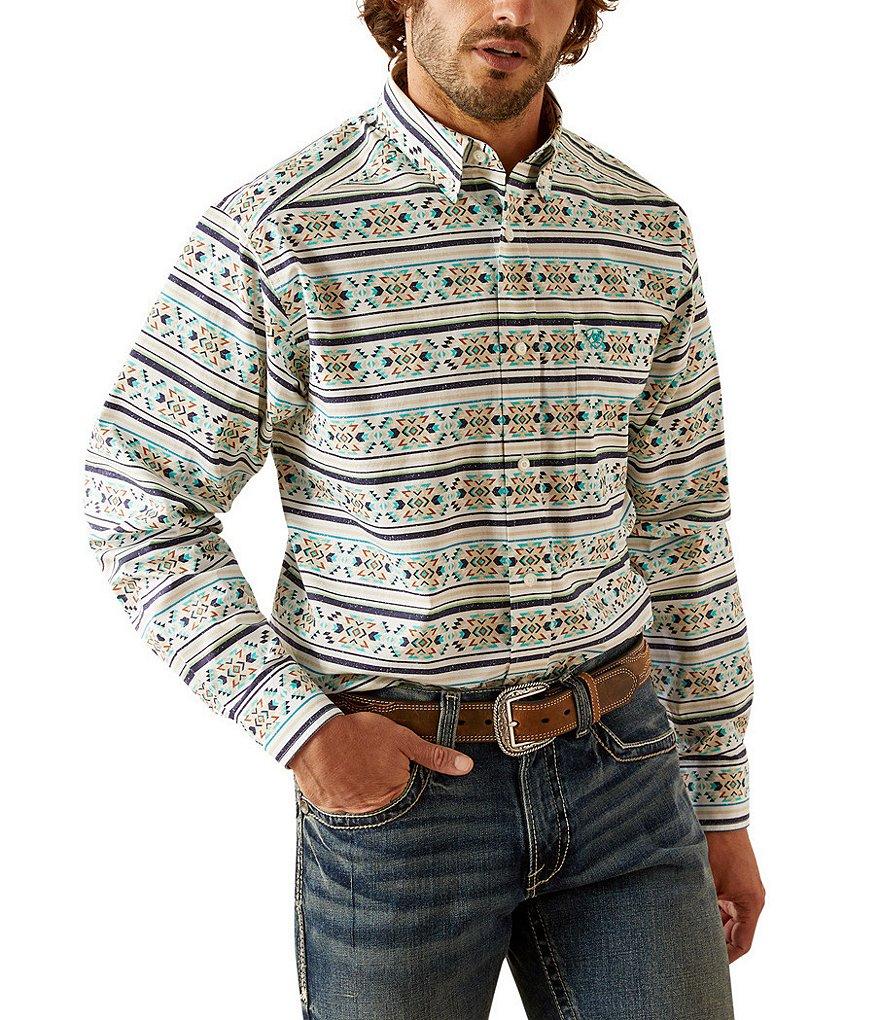 From Ariat, this shirt features: Button-down collar Long sleeves Adjustable cuffs with extended button detail Button-front closure Left-chest pocket with pen/pencil slot Ariat branding on the pocket and back neck Generous fit with extra length for tucking and reaching Classic styling, rugged comfort and quality construction Woven cotton Machine wash/tumble dry Imported.