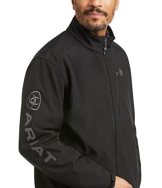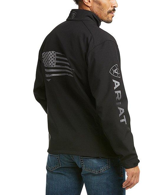 From Ariat, this jacket features: Stand collar Long sleeves Embroidered tonal flag on back and embroidered logos Interior concealed carry pocket & sleeve Full zip closure Contrast trims and logos Zippered hand and chest pockets Adjustable waist cord and cuffs Seam construction Softshell stretch nylon with microfleece backing for superior heat retention Laminated finish Wind and water resistant with breathability nylon Machine wash/tumble dry Imported