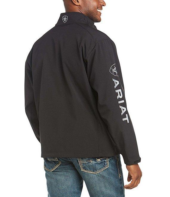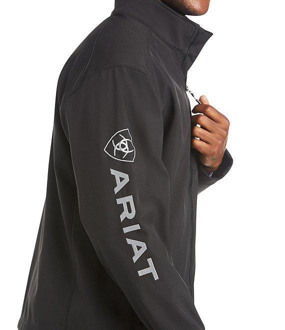 From Ariat, this jacket features: contrast trims and embroidered logos full-zip closure adjustable shock cord welded chest pocket zippered hand pockets greater arm mobility seam construction for maximum range of motion wind and water resistant softshell stretch nylon with microfleece backing machine wash/tumble dry Imported.