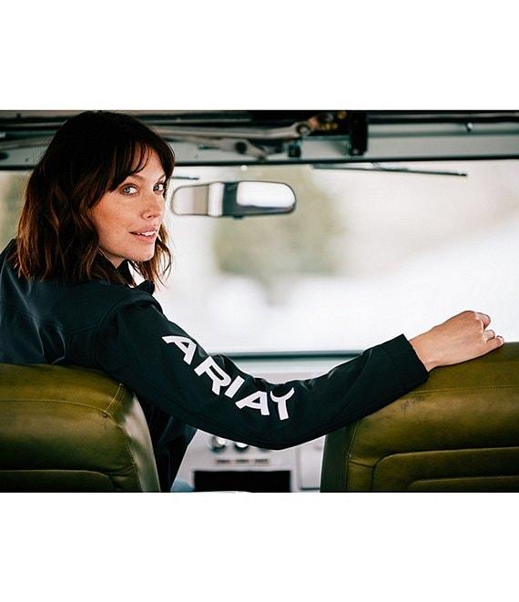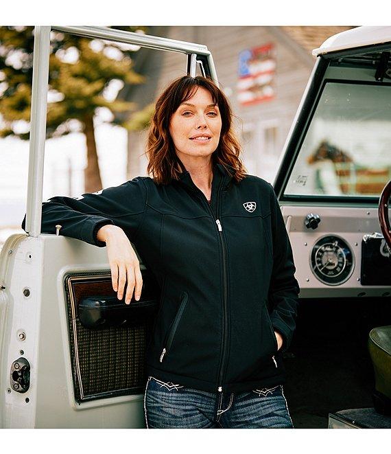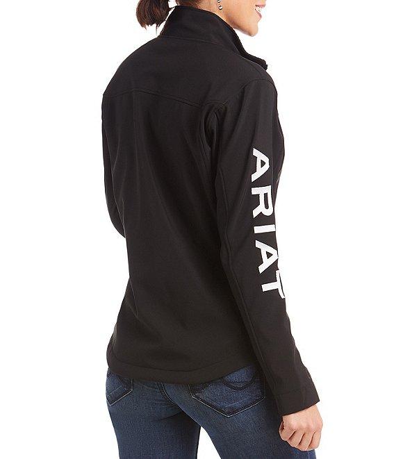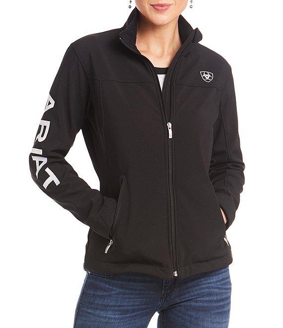 From Ariat, this jacket features: Softshell stretch nylon fabrication Stand collar long sleeves Microfleece backing for heat retention Wind & water resistant with breathability Zippered hand pockets high-low hemline zip front closure Polyester/spandex Machine wash Imported.